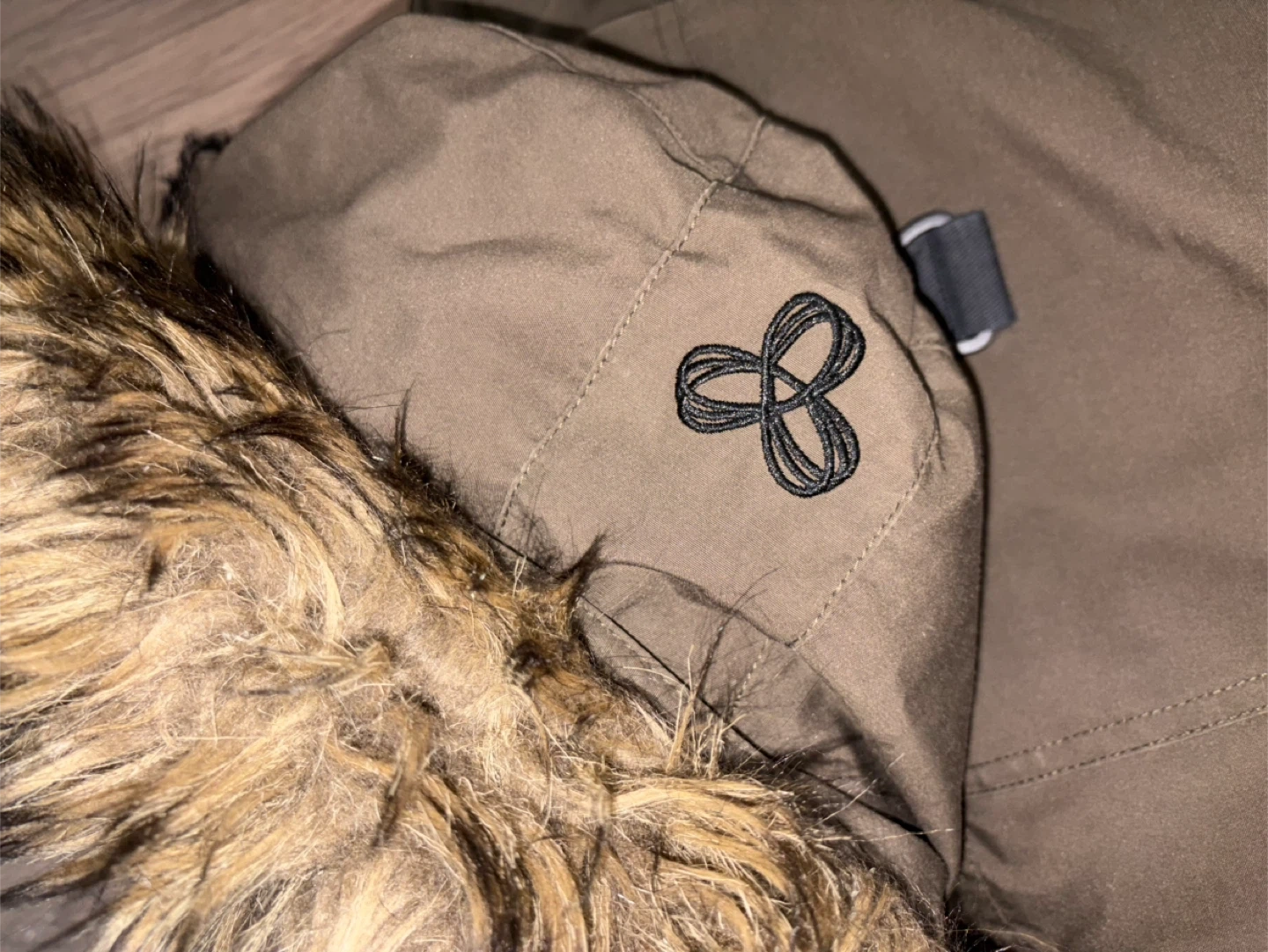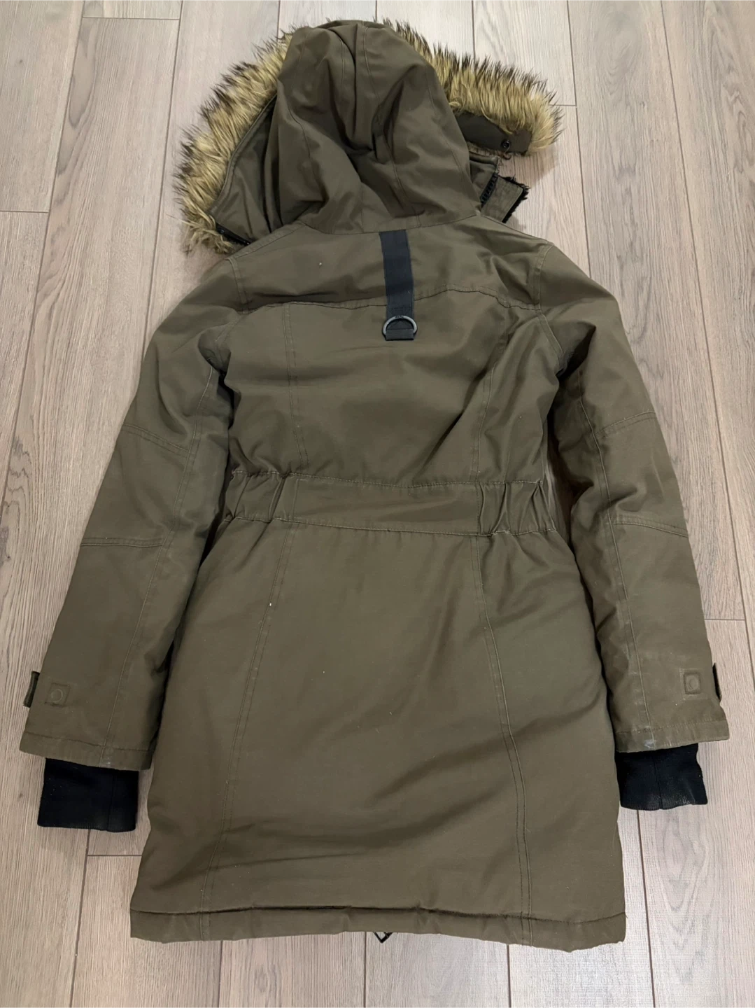 A warm TNA parka jacket in size XS. It's a khaki green colour with a faux fur lined hood. Features a zippered front and multiple pockets (zippered and magnetic). Good condition. 80% duck down, 20% duck feathers. Very warm! White scuff marks can be easily removed.