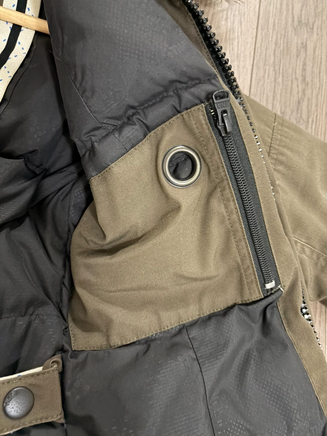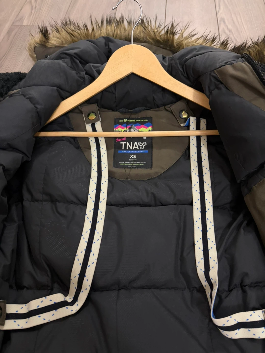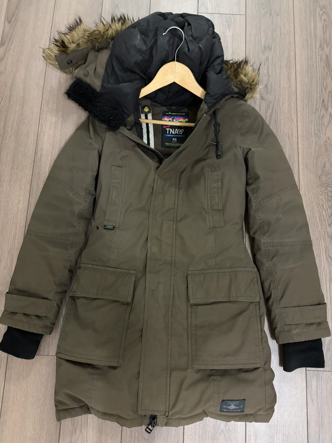 A warm TNA parka jacket in size XS. It's a khaki green colour with a faux fur lined hood. Features a zippered front and multiple pockets (zippered and magnetic). Good condition. 80% duck down, 20% duck feathers. Very warm! White scuff marks can be easily removed.