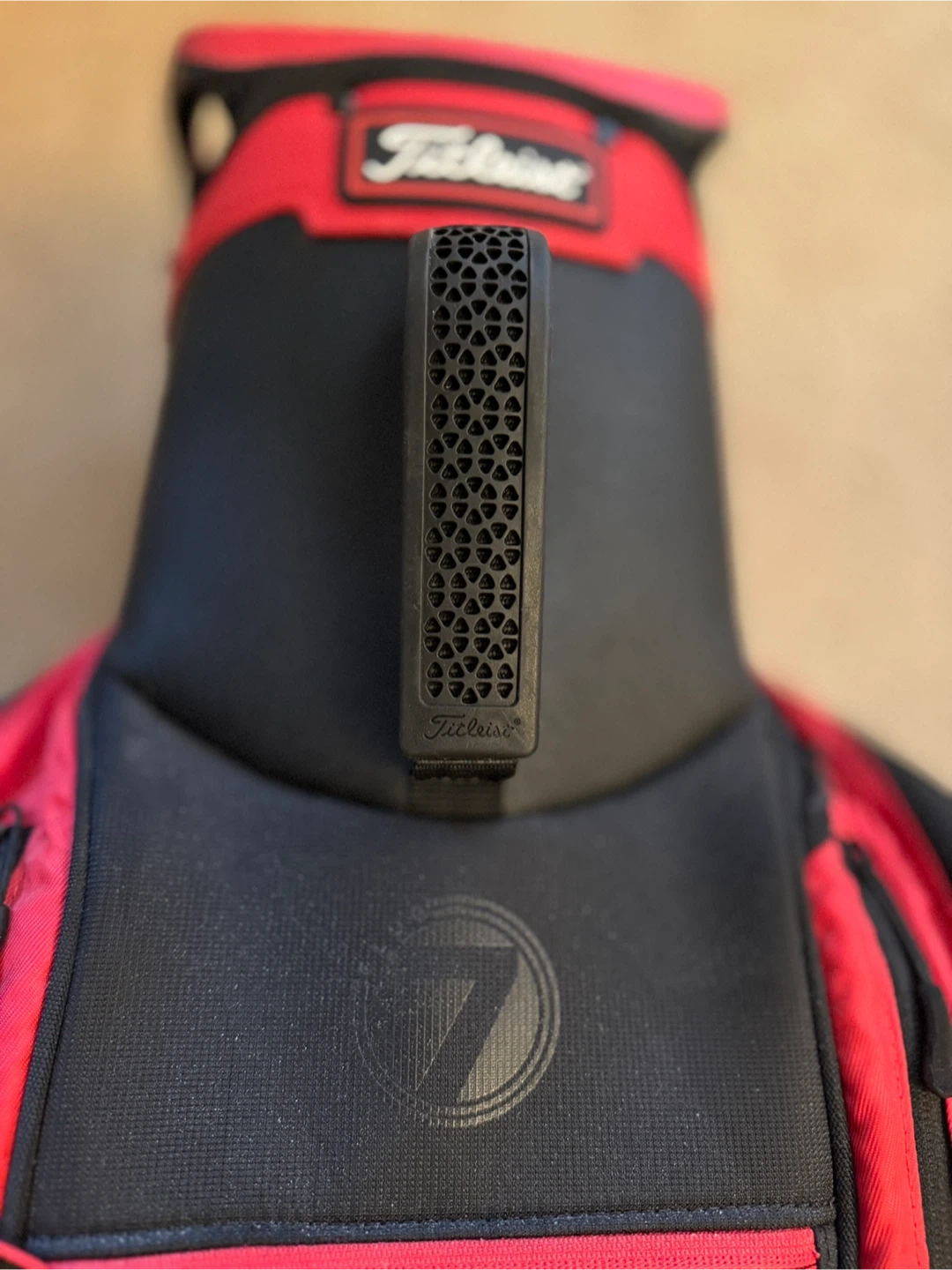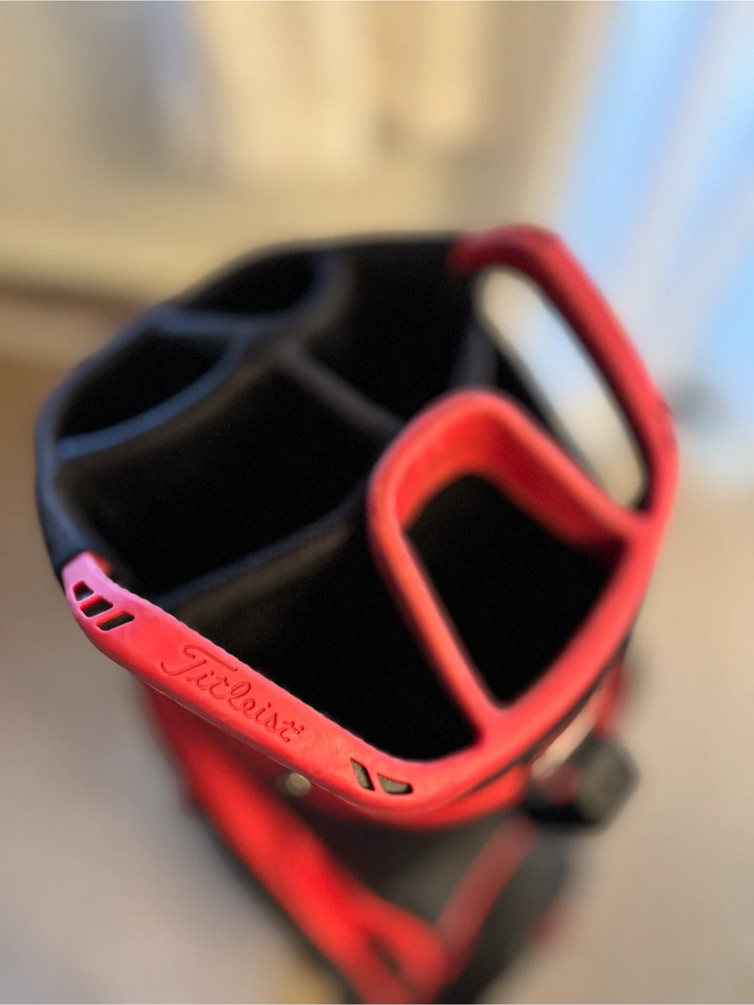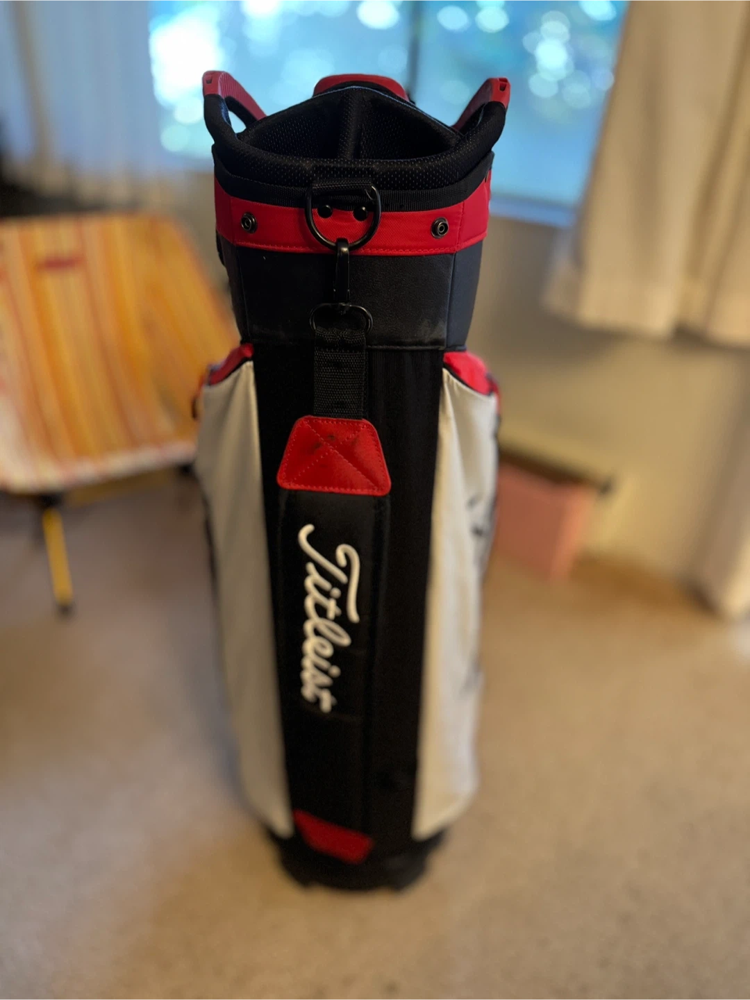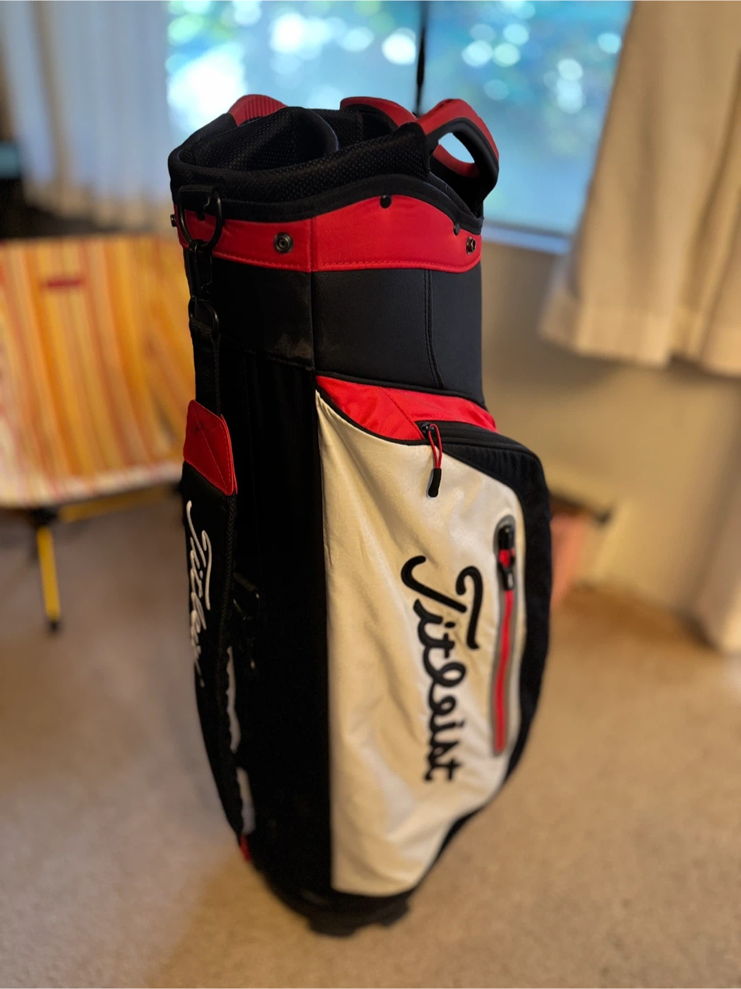 Black and red Titleist golf bag. It's got multiple zippered pockets for all your gear. Includes a sturdy handle and a shoulder strap.