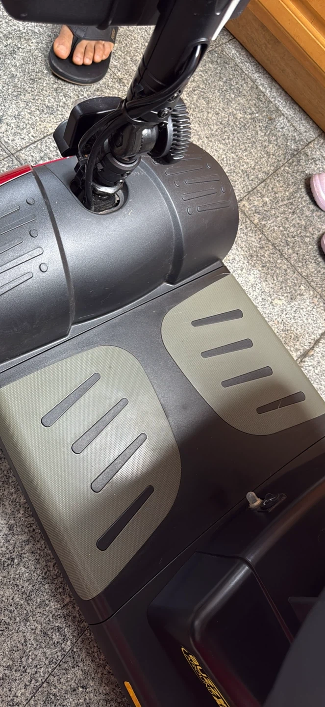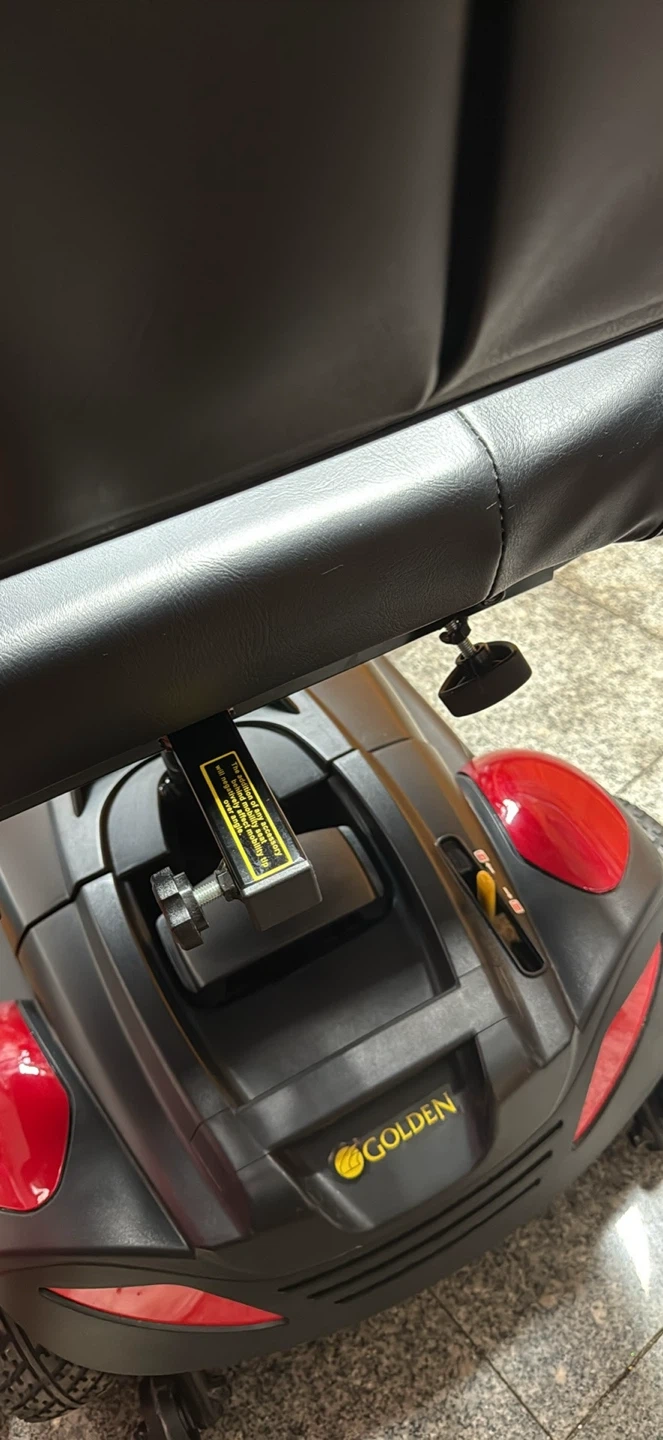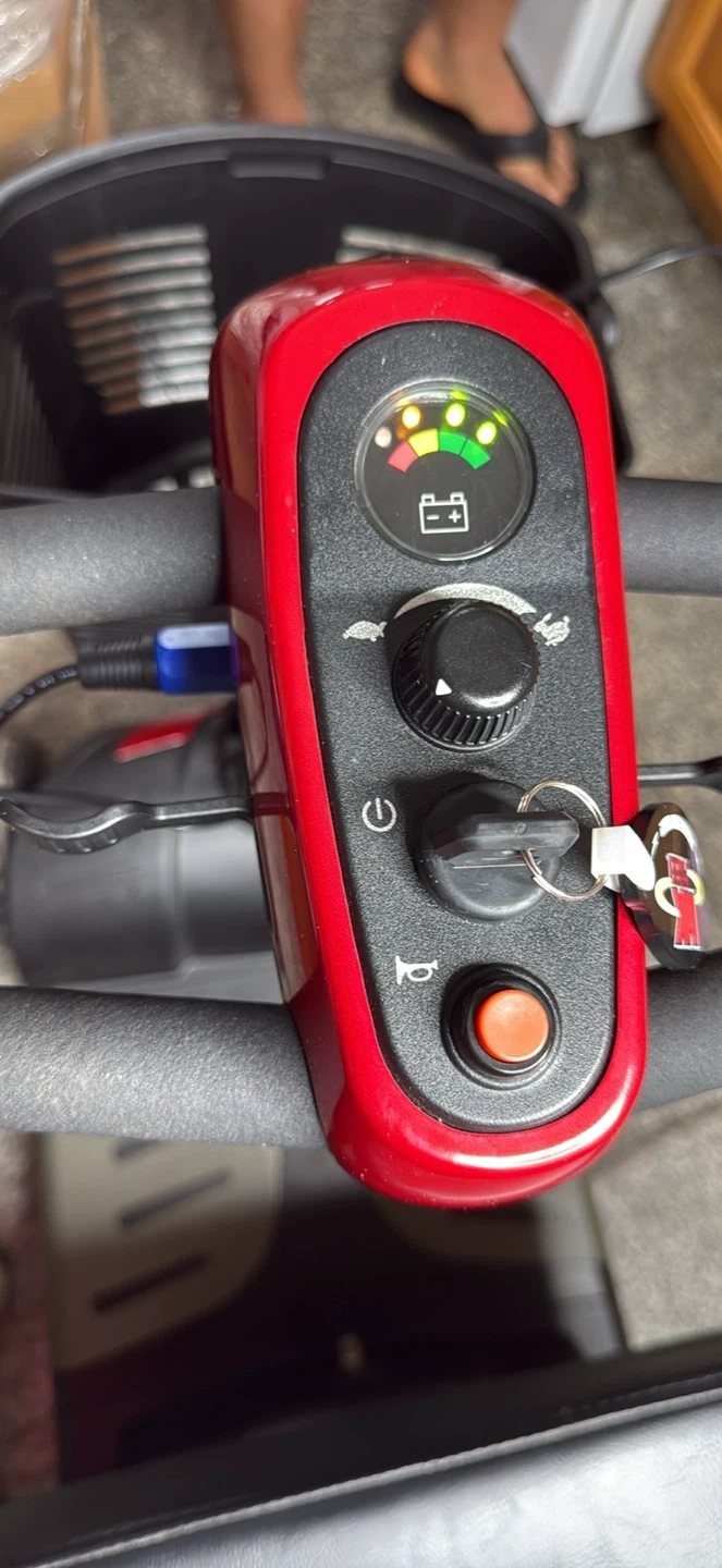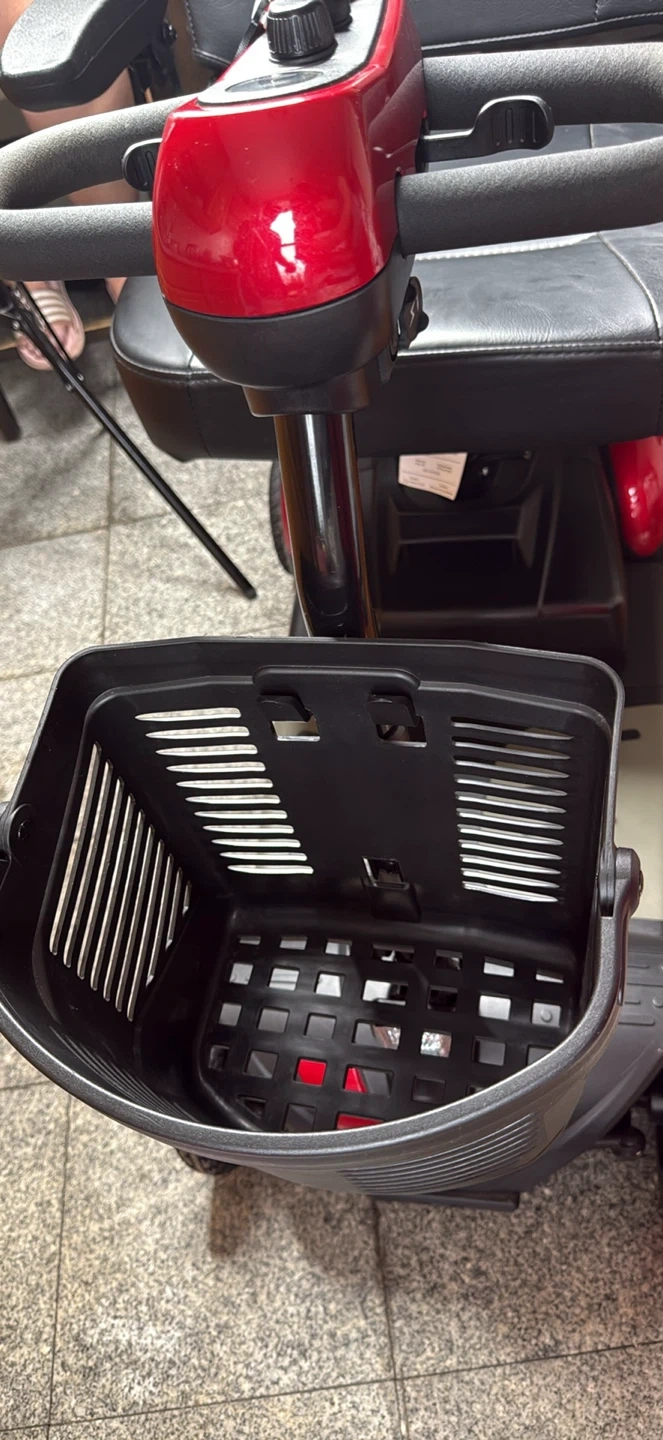 This is a Buzzaround XL mobility scooter. It’s a red electric scooter with a black seat and basket. It needs a battery change and it doesn’t have a charger