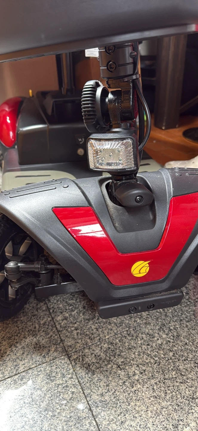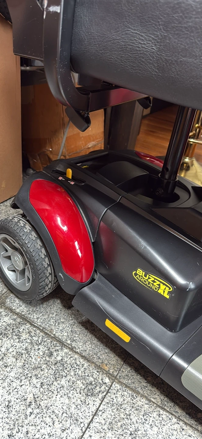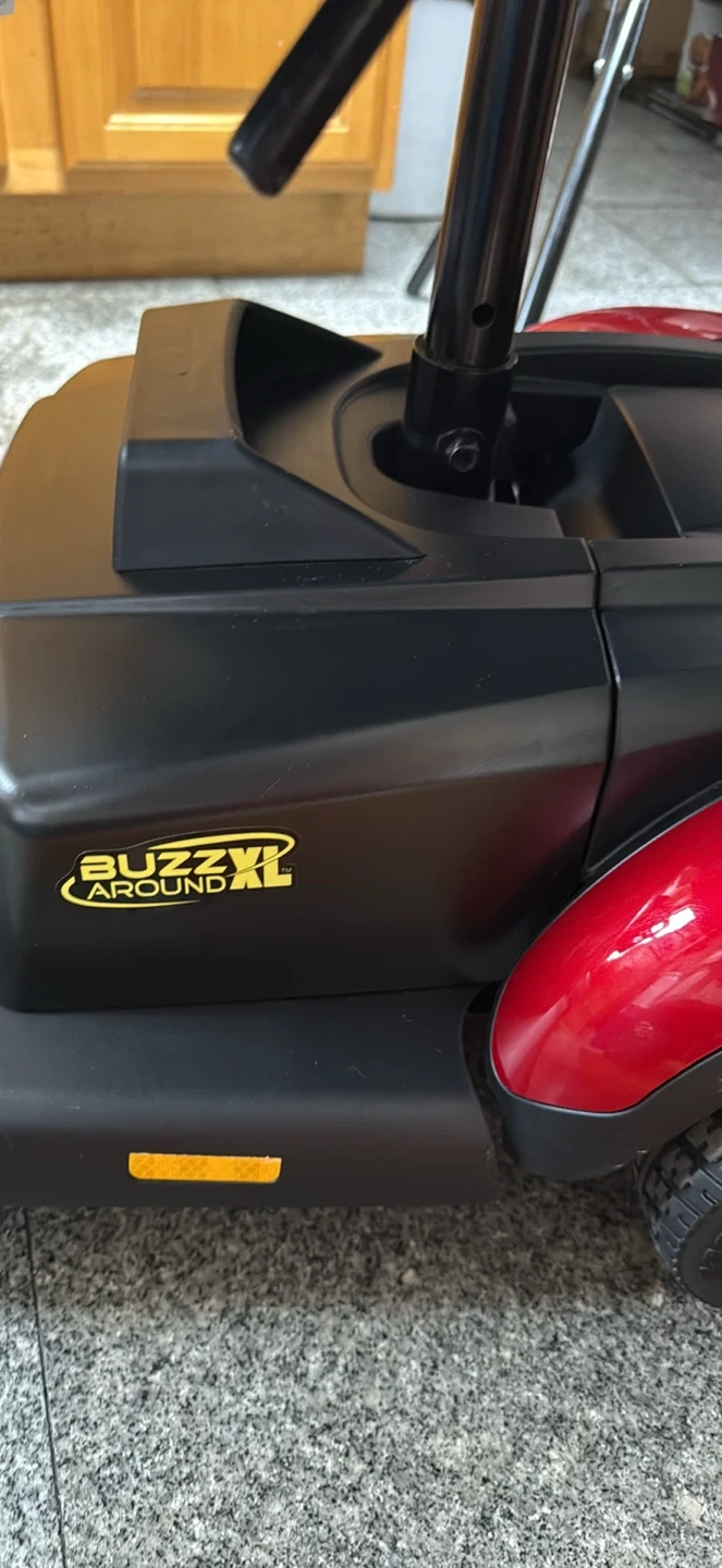 This is a Buzzaround XL mobility scooter. It’s a red electric scooter with a black seat and basket. It needs a battery change and it doesn’t have a charger