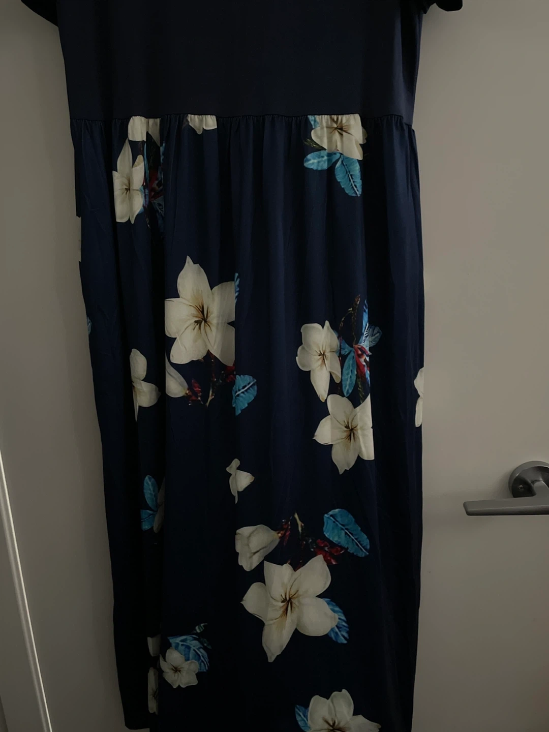 This cold shoulder maxi dress features a dark navy base with a vibrant floral print. It has a comfortable fit with short sleeves and a flattering flowy skirt. This dress is perfect for casual outings or summer events!