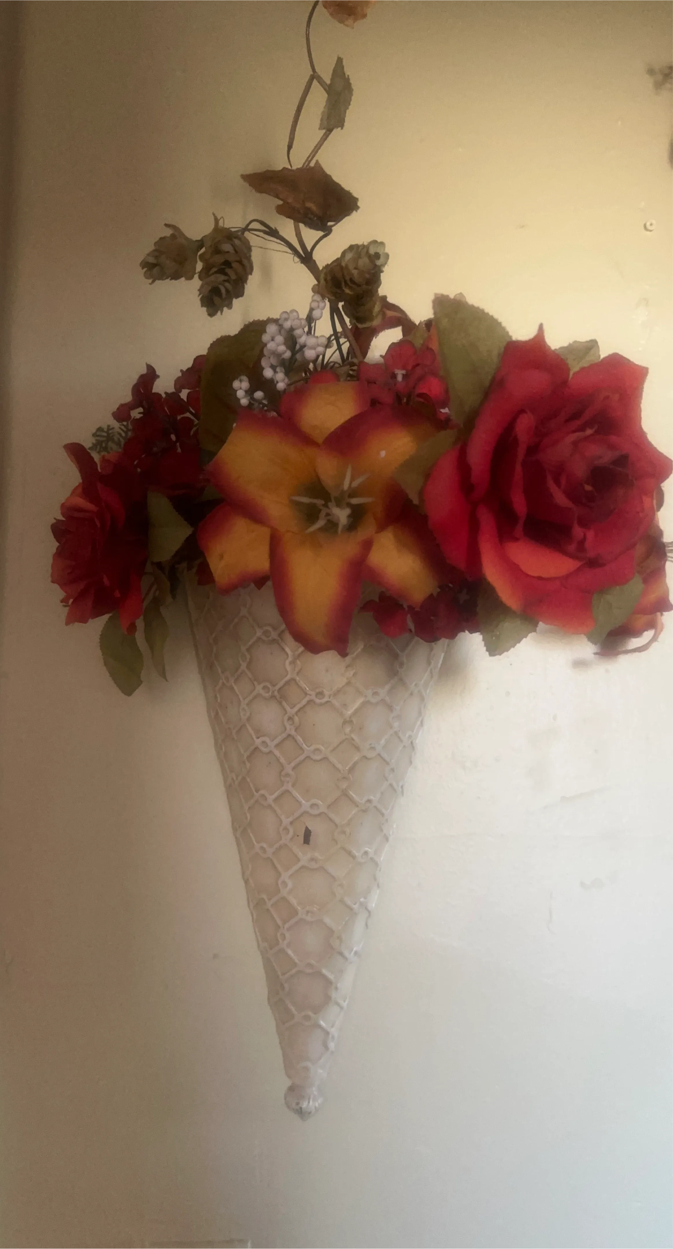 This artificial floral arrangement features red roses, orange and yellow lilies, and other red flowers with greenery. It's housed in a cream-colored cone holder with a textured netting design. It's a decorative piece perfect for adding a touch of color to any room!