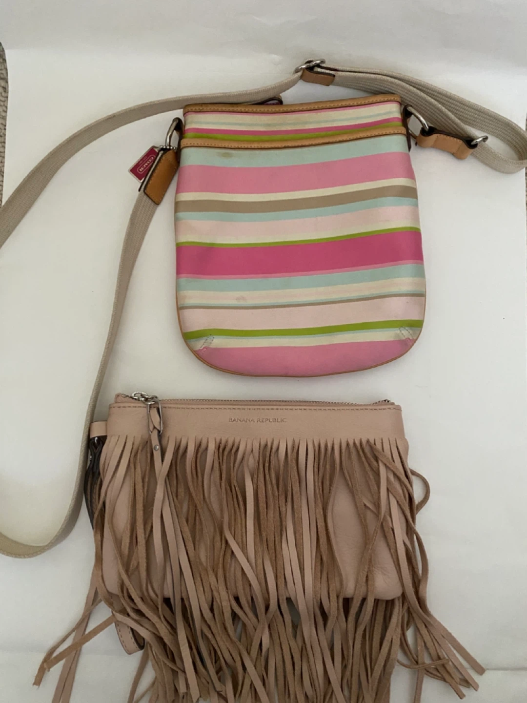 Two stylish bags for your essentials. The Coach crossbody features a colourful stripe pattern. The Banana Republic clutch has a chic beige fringe design. $30 each