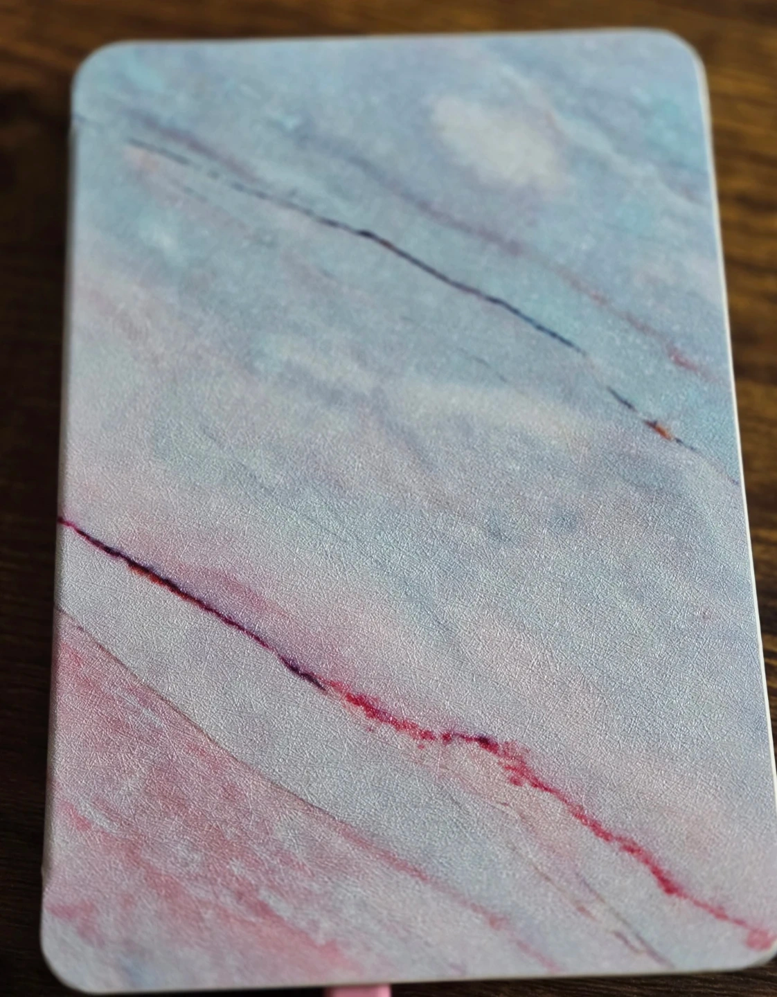 This is an Amazon Kindle e-reader. It features a black bezel and a decorative marble-patterned cover. It's perfect for reading all your books on the go! Cover i purchased seperately and a tad large, but does hold it. Can replace easily.