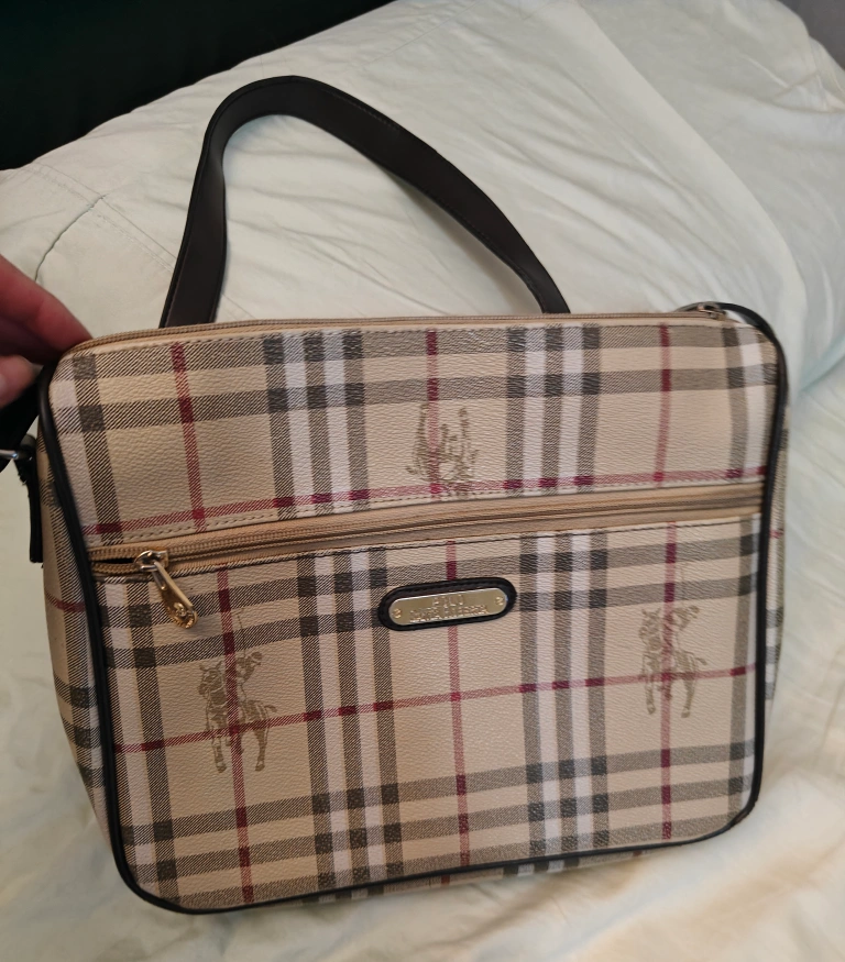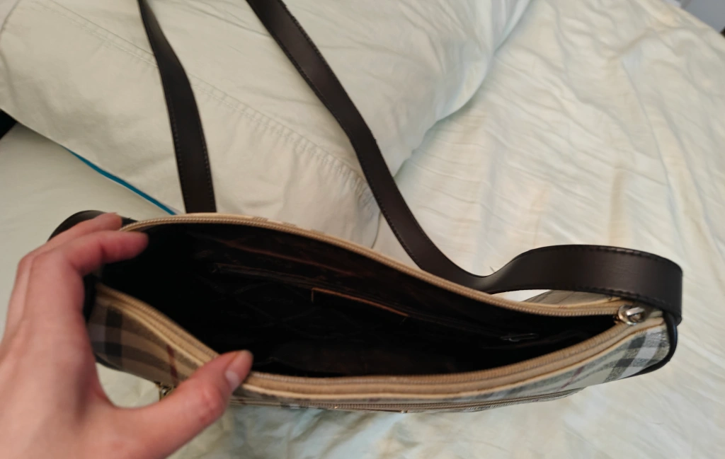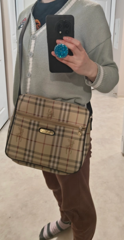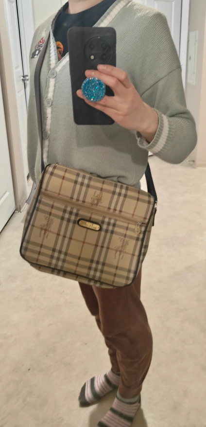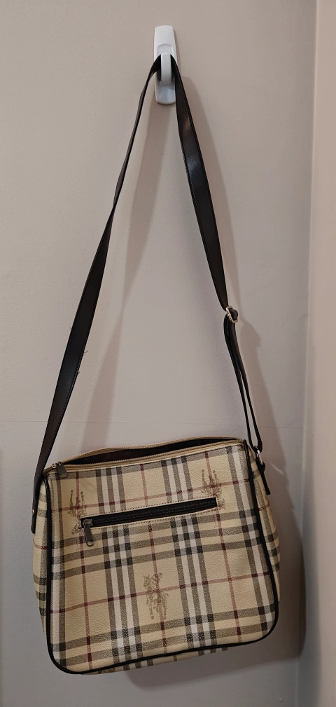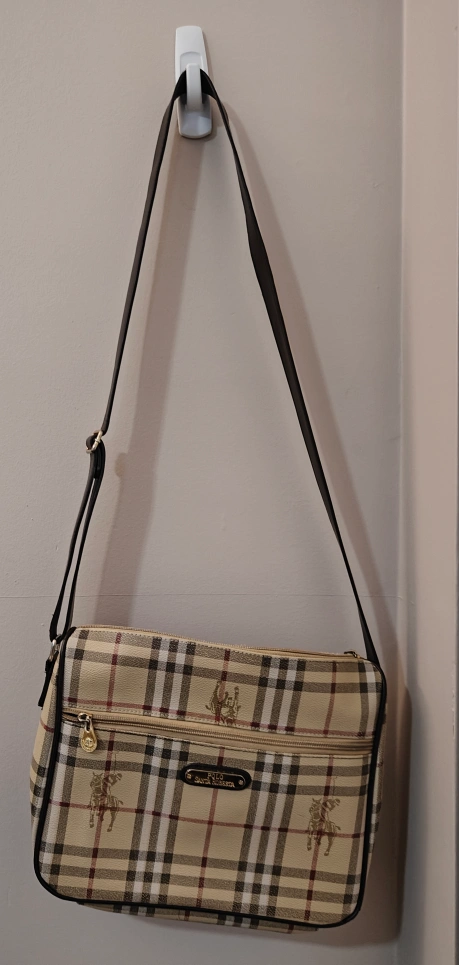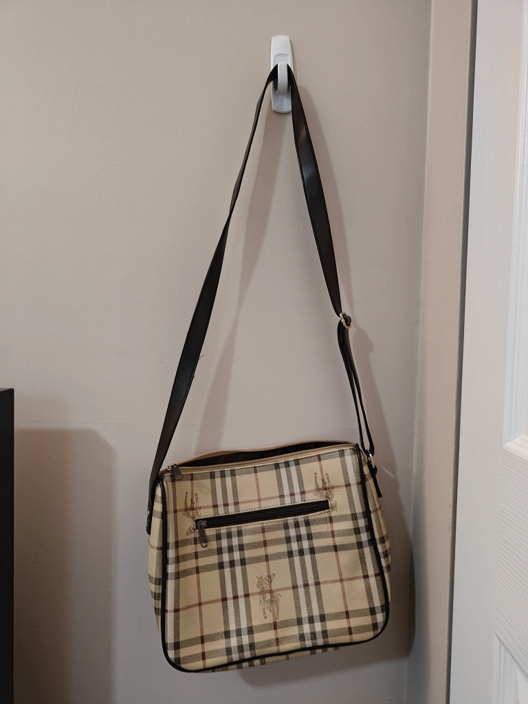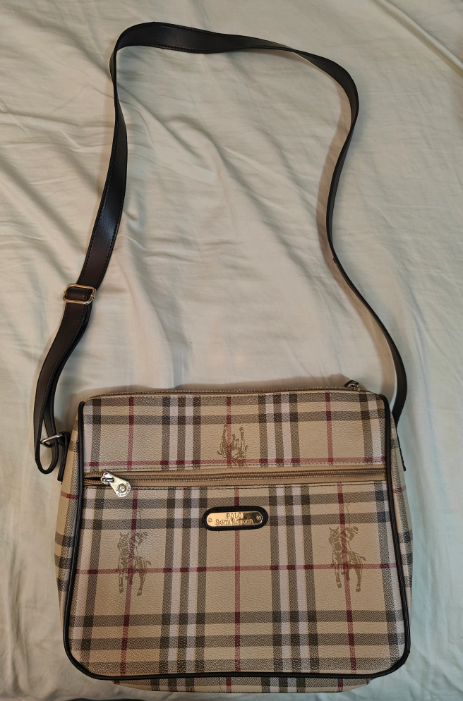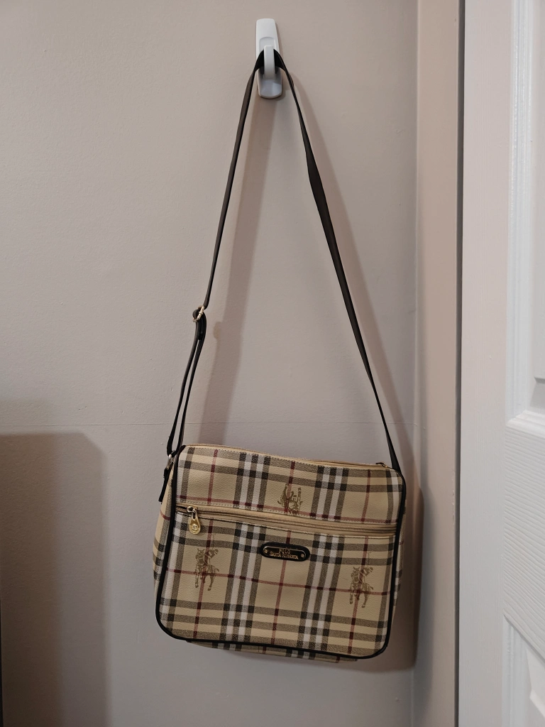 Pre-owned crossbody bag. Beige and brown plaid print. Features a long adjustable strap and zipper closure. Small embroidered logos throughout. Has a smaller inner pocket inside the bag to fit keys and wallet. Can fit a Samsung Tablet, small notebook and stationery items for school or work.
