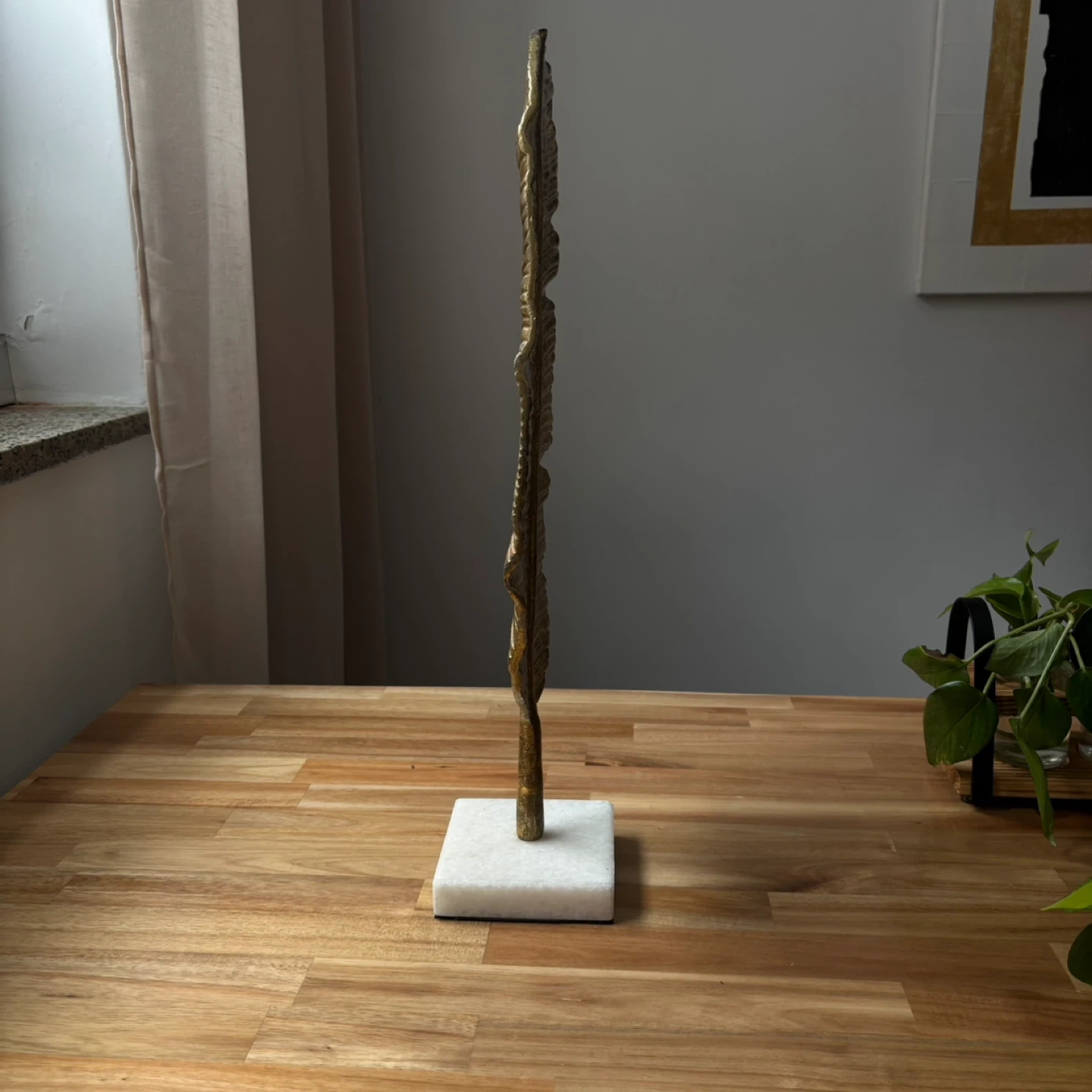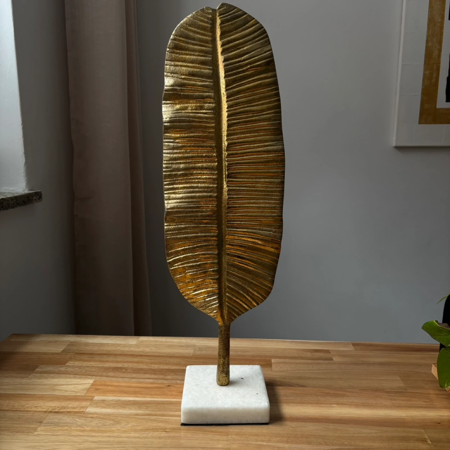 Add a touch of elegance to your space with this striking gold leaf sculpture. It stands on a stylish white marble base. Its textured metallic finish makes it a captivating decorative piece.