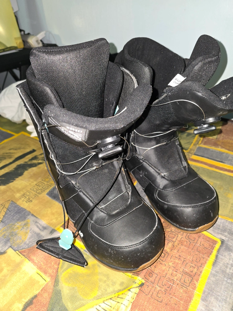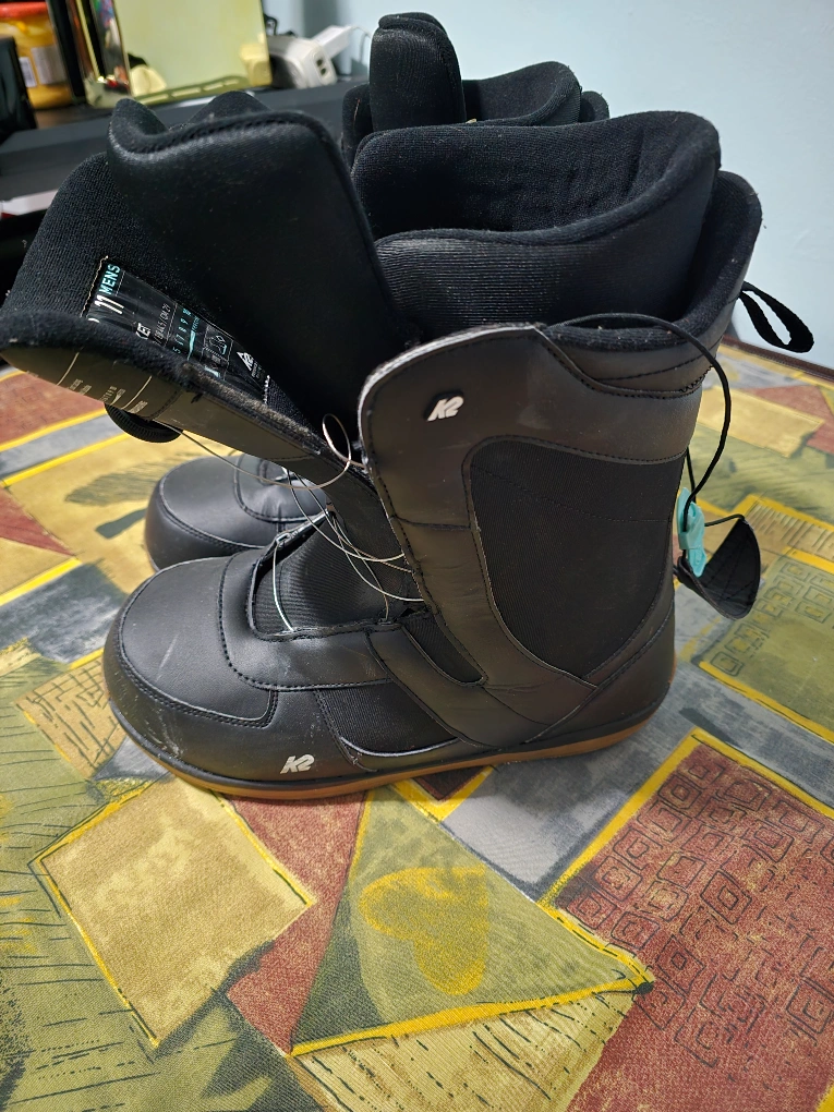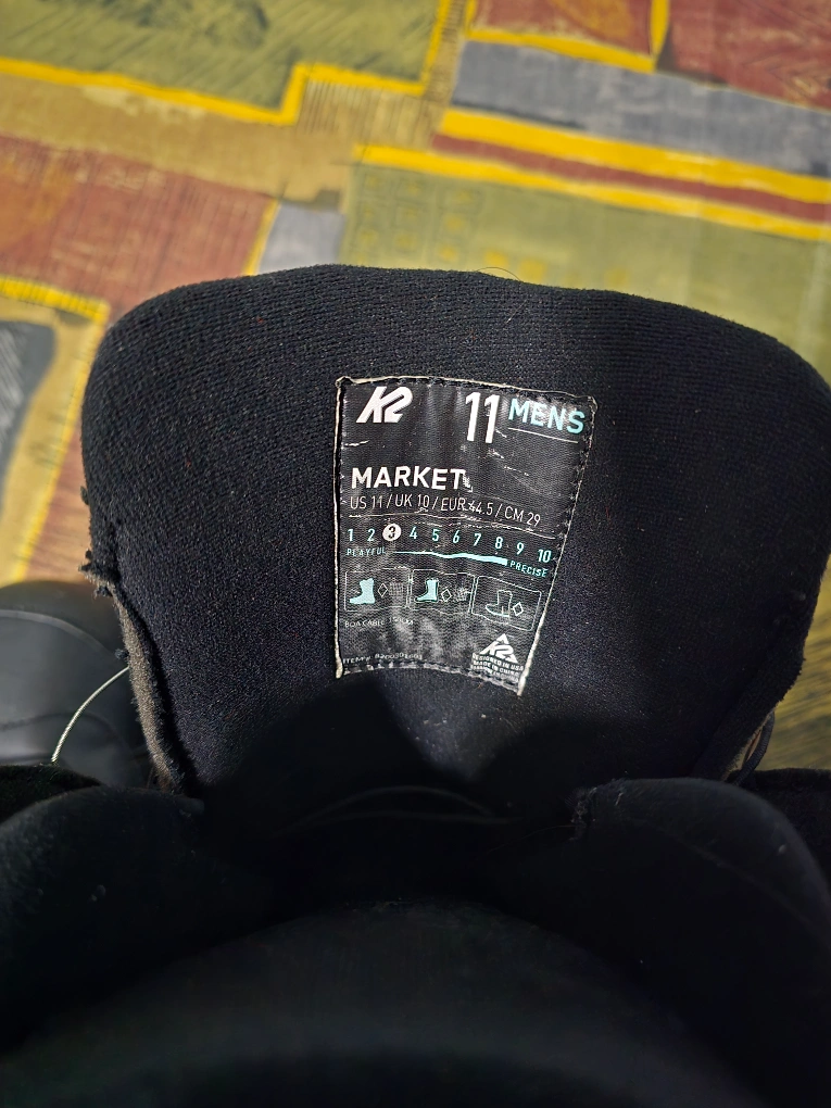 K2 "Market" snowboard boots for men. They're black and size 11 US. Features comfort foam lining and a BOA lacing system. Ready for the slopes!
