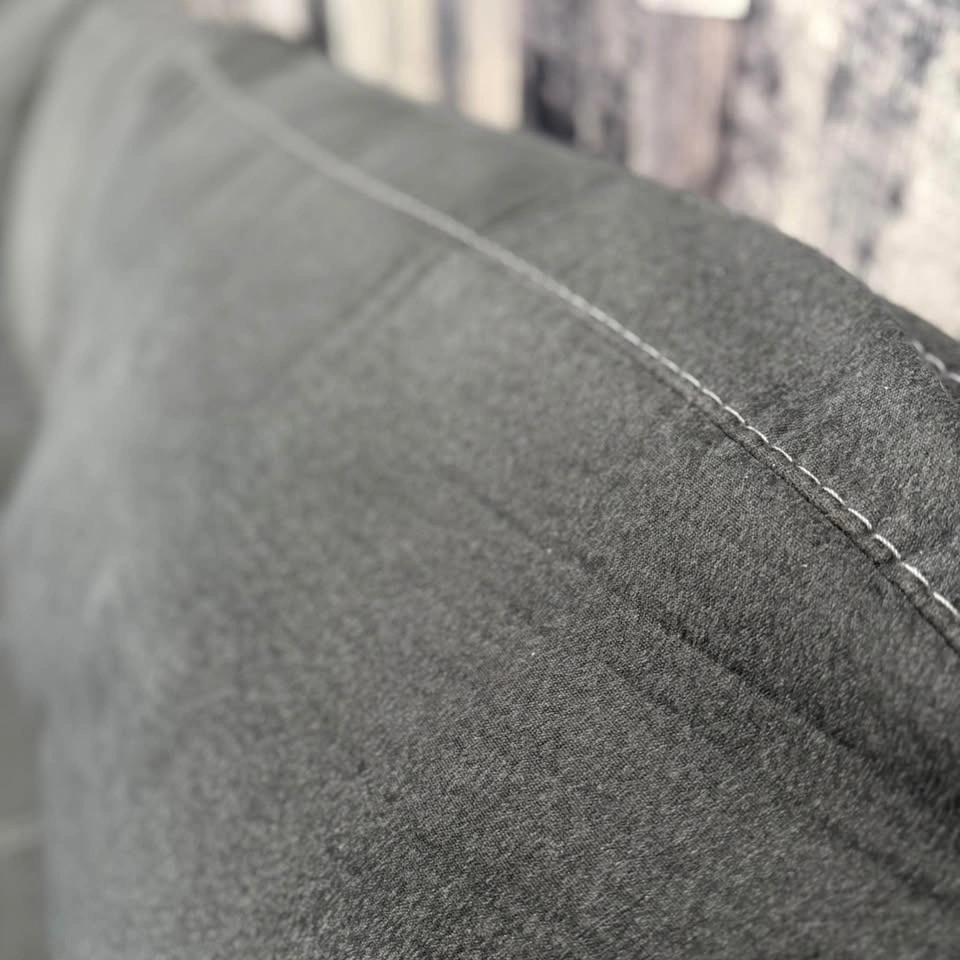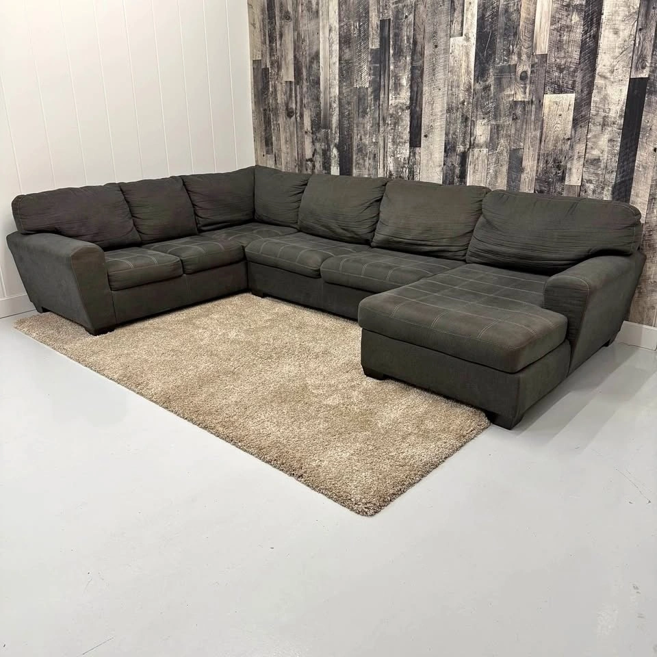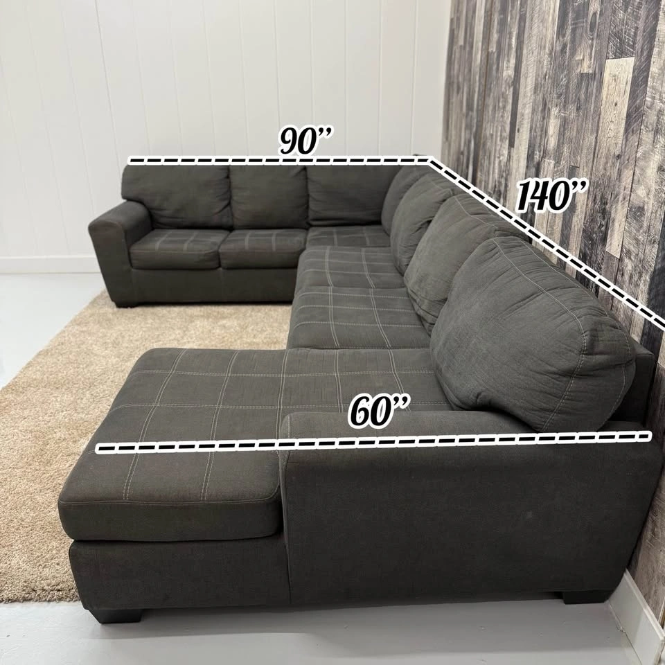 Ashley Altari U-shape sectional in charcoal woven polyester upholstery. Features removable & machine washable cushion covers, structured seat cushions with supportive back pillows, and a neutral modern tone. Professionally steam cleaned with fabric shampoo and enzyme treatment. This sofa comes from a non-smoking home with no stains, rips, or tears. Dimensions are shown in the last photo.