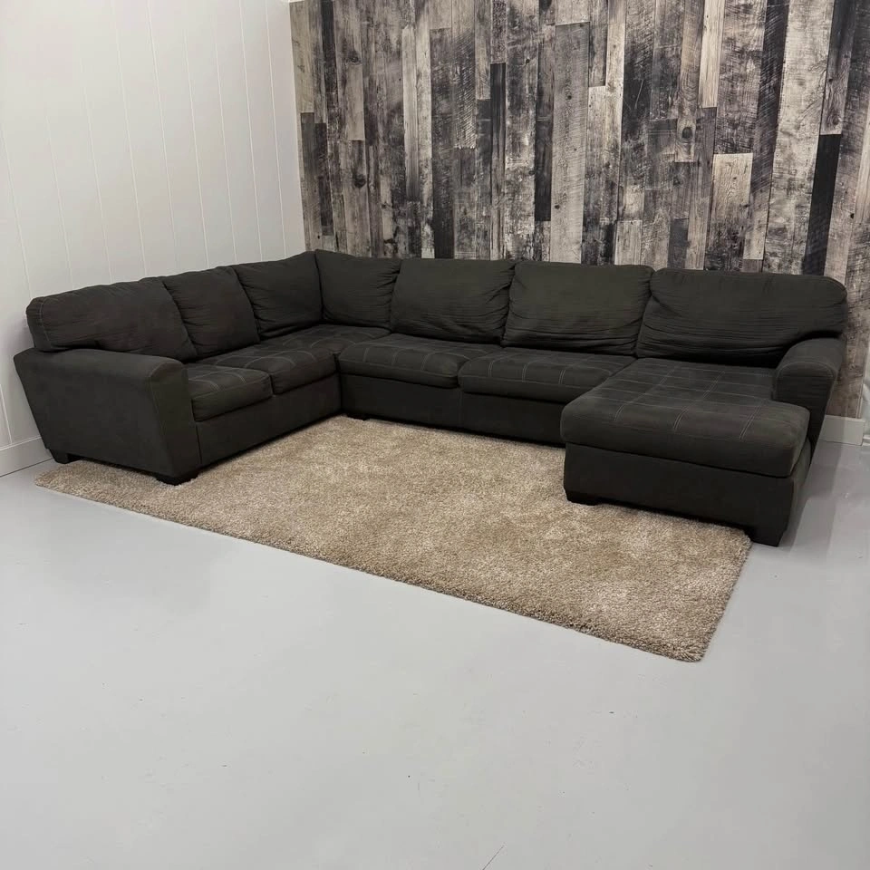 Ashley Altari U-shape sectional in charcoal woven polyester upholstery. Features removable & machine washable cushion covers, structured seat cushions with supportive back pillows, and a neutral modern tone. Professionally steam cleaned with fabric shampoo and enzyme treatment. This sofa comes from a non-smoking home with no stains, rips, or tears. Dimensions are shown in the last photo.