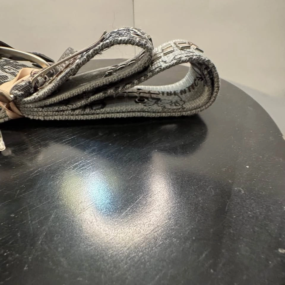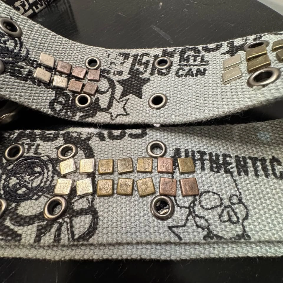 features a webbed, canvas-like material with a repeating graphic print and pyramid-style metal studs. It has a distinctive metal buckle and a small leather keeper loop with branded details.