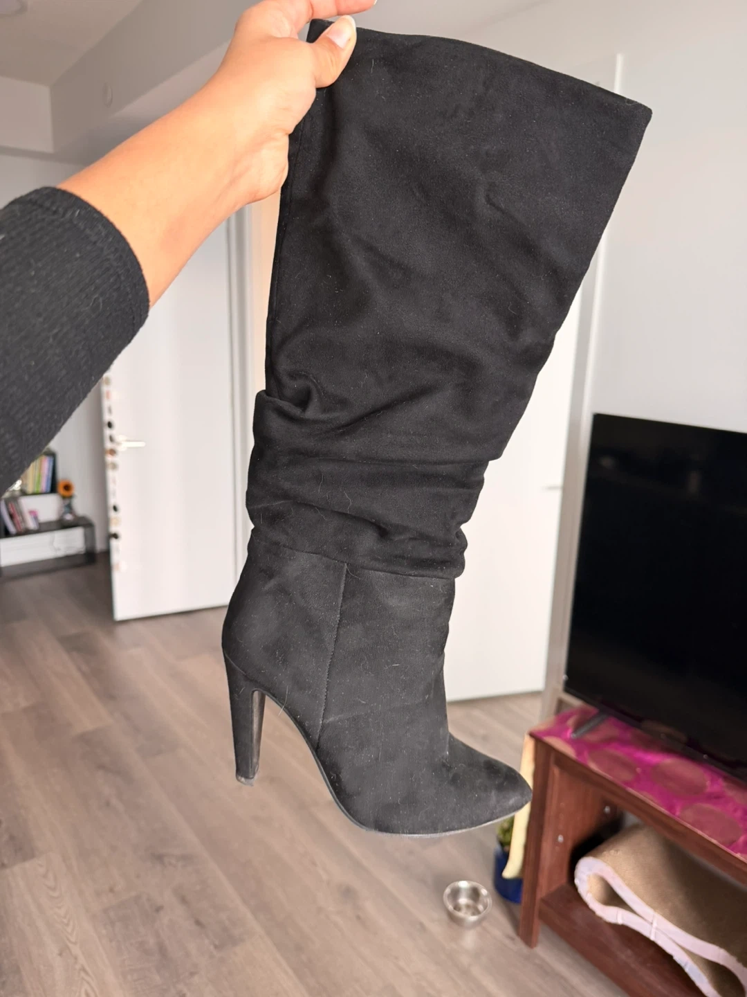 These black boots have a stylish high heel. Made from a soft, suede-like material, they're perfect for dressing up an outfit.