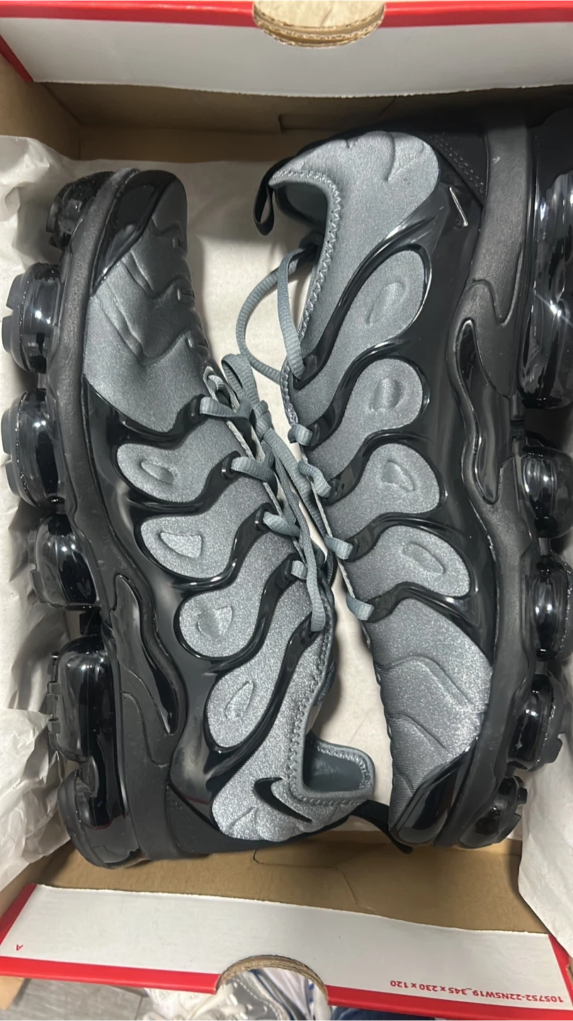 Nike Air VaporMax Plus sneakers in black and grey. These shoes feature a neoprene-like upper with synthetic overlays and the iconic VaporMax Air cushioning unit. Lace-up closure for a secure fit.