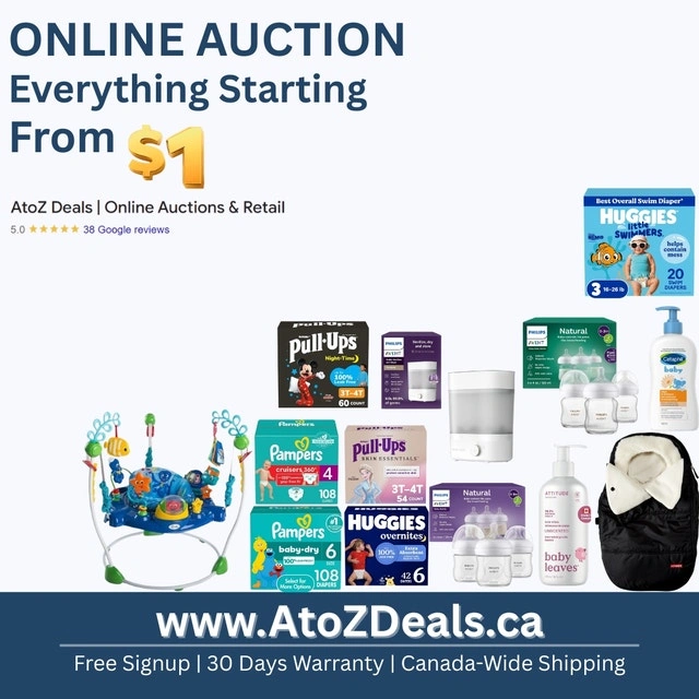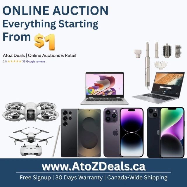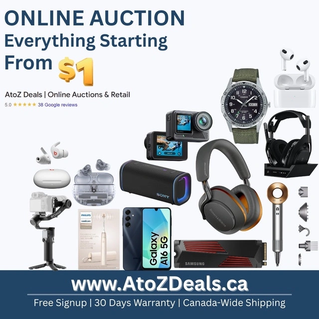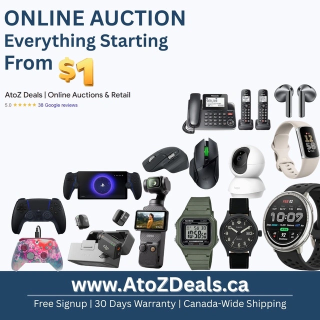 1-MONTH WARRANTY | NO BUYERS' PREMIUM OR HIDDEN FEES—you only pay what you bid plus taxes! Shop a wide range of products, from electronics and home essentials to fashion, tools, and more, with more items added daily. Pickup From Our Etobicoke warehouse. REGISTER TODAY and START BIDDING! Products like DJI Drones, Sony PS5 and PlayStation portals, iPhones, Samsungs, Beats, Cameras, watches like Casio, Bulova, Timex, Laptops like Asus, Acer, Dell, baby items, women's essentials, and clothing, men's essentials, and clothing are regularly featured on AtoZ Deals.