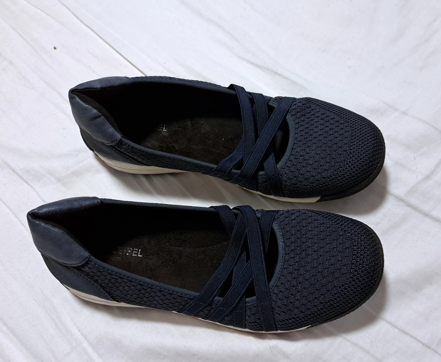 Comfortable Ryerson slip-on flats in a navy blue colour. These shoes feature a knit upper with criss-cross elastic straps for a secure fit. The soles are durable and offer good traction. Size is marked as 39.