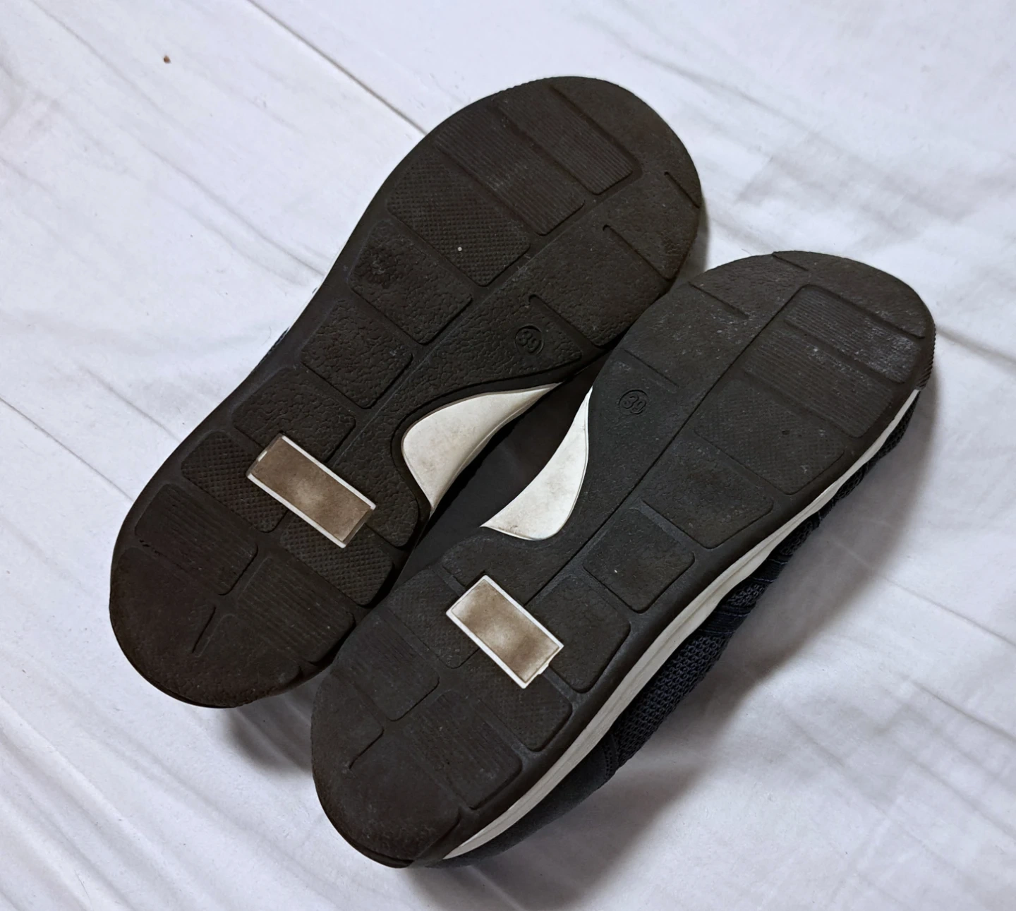 Comfortable Ryerson slip-on flats in a navy blue colour. These shoes feature a knit upper with criss-cross elastic straps for a secure fit. The soles are durable and offer good traction. Size is marked as 39.