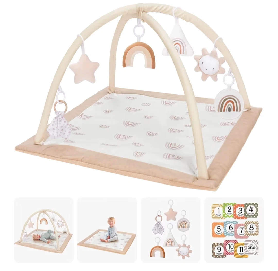 This baby activity gym is in excellent condition and ready for a new home! It features a soft mat with a neutral rainbow pattern and a supportive frame with hanging toys like a star, rainbow, and sun. Perfect for tummy time and early development!