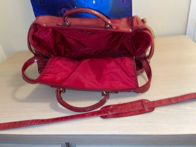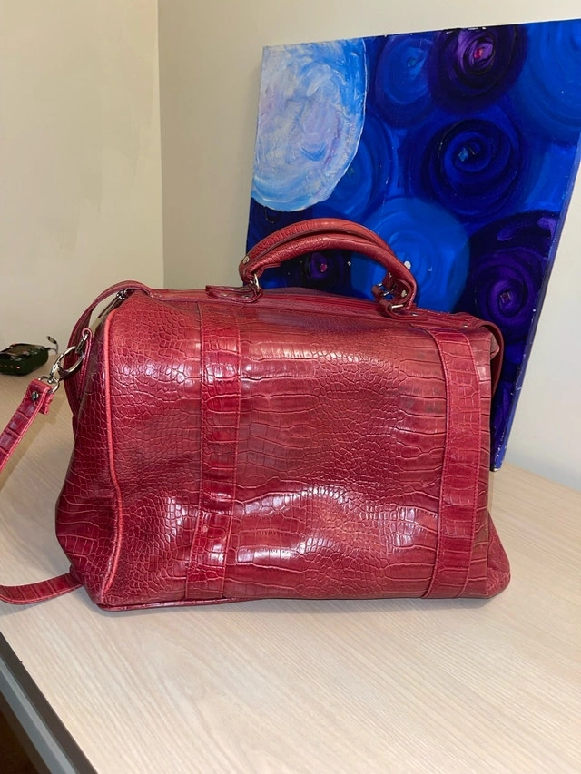 I'm selling a stylish Bath & Body Works satchel, perfect for travel or everyday use, featuring a chic red crocodile pattern. This is a used item. Brand: Bath & Body Works, Colour: Red, Pattern: Crocodile. If the ad is up, the bag is available. Cash accepted.