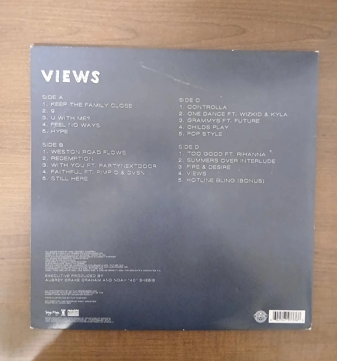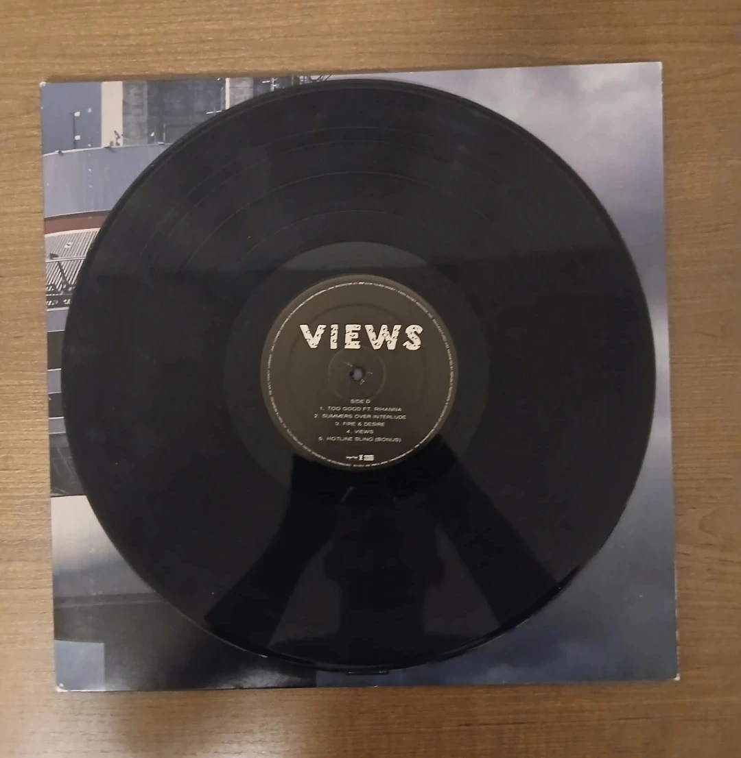 Drake's Views vinyl record album. Features tracks like "Hotline Bling", Controlla and "One Dance". Comes with the full tracklist printed on the back. A must-have for any vinyl collector in the 6.