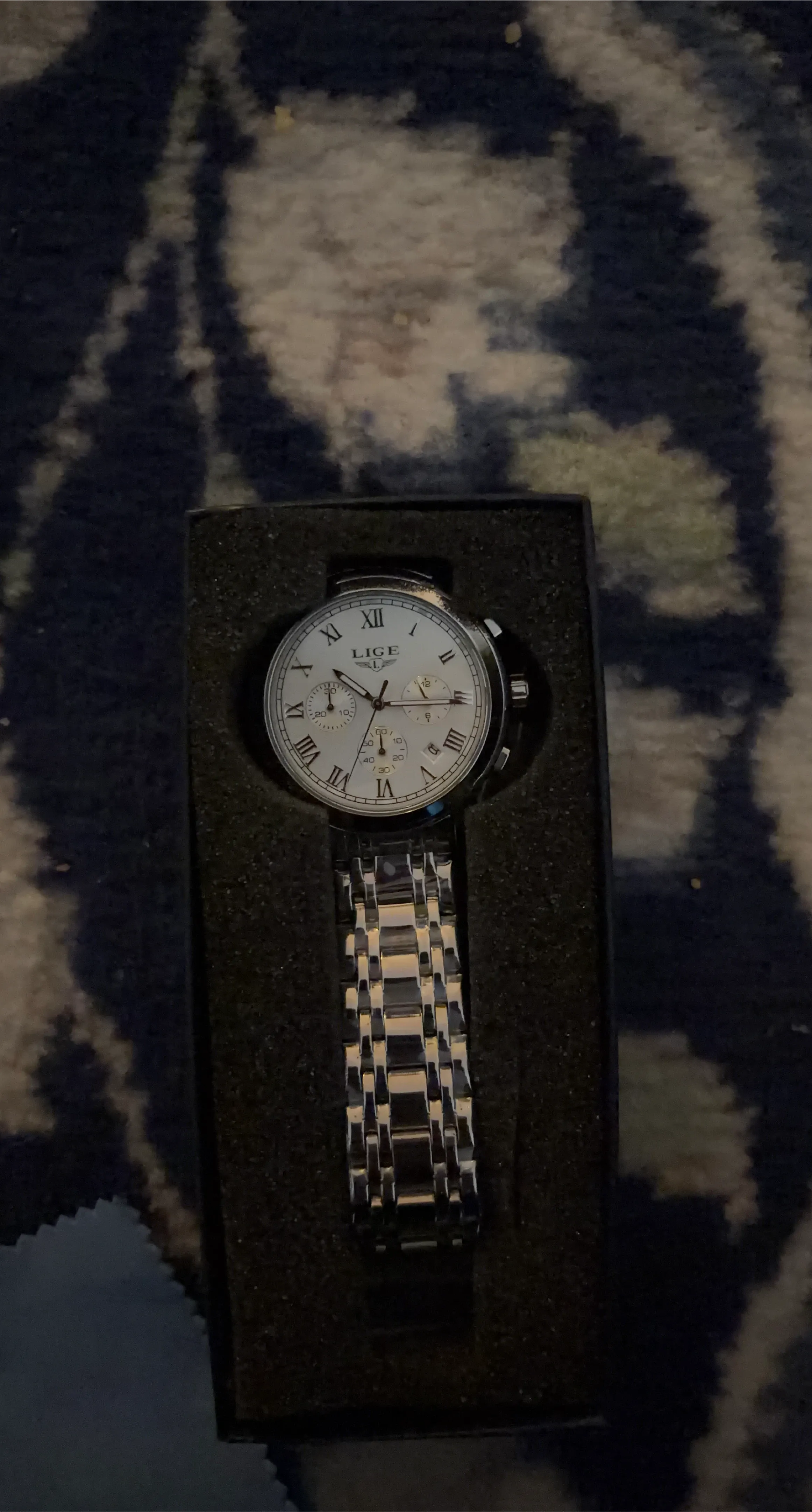 This is a LIGE men's chronograph watch. It features a white dial with Roman numerals and sub-dials. The watch has a stainless steel band and comes in its original box. It's a stylish accessory for everyday wear!