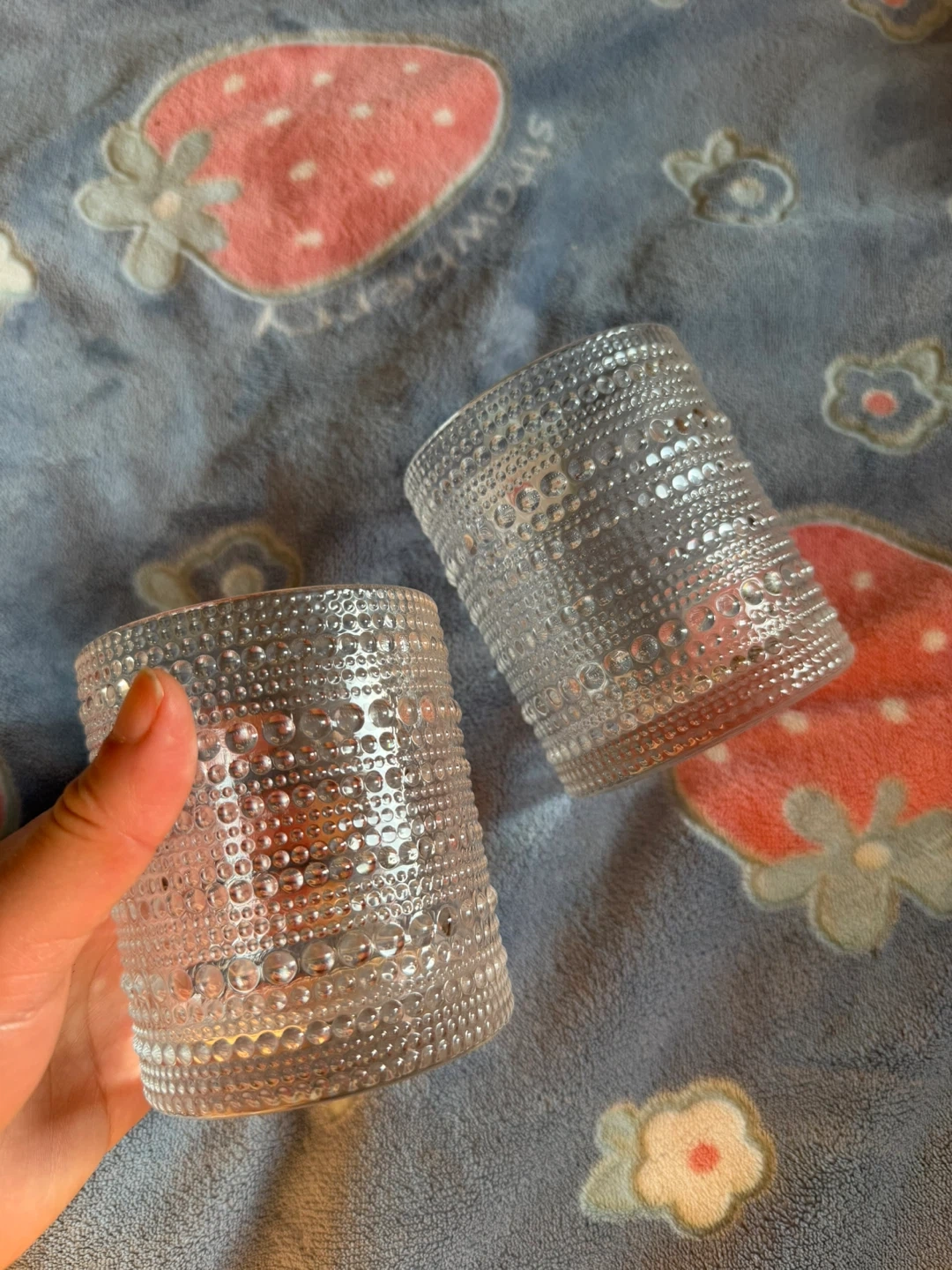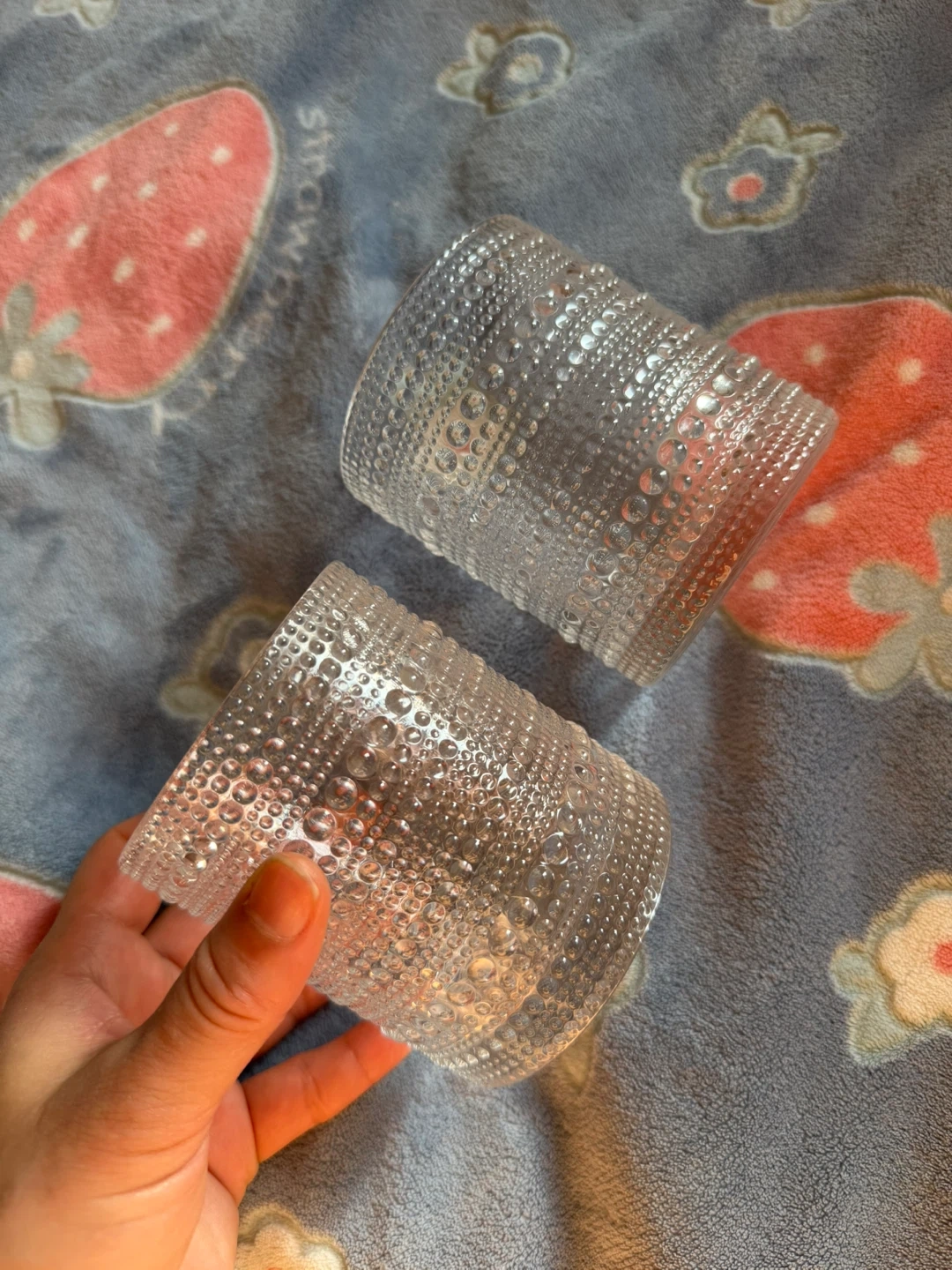 Two clear glass with a textured bubble design. These glasses have a unique tactile feel and a classic shape. Perfect for everyday use or special occasions!