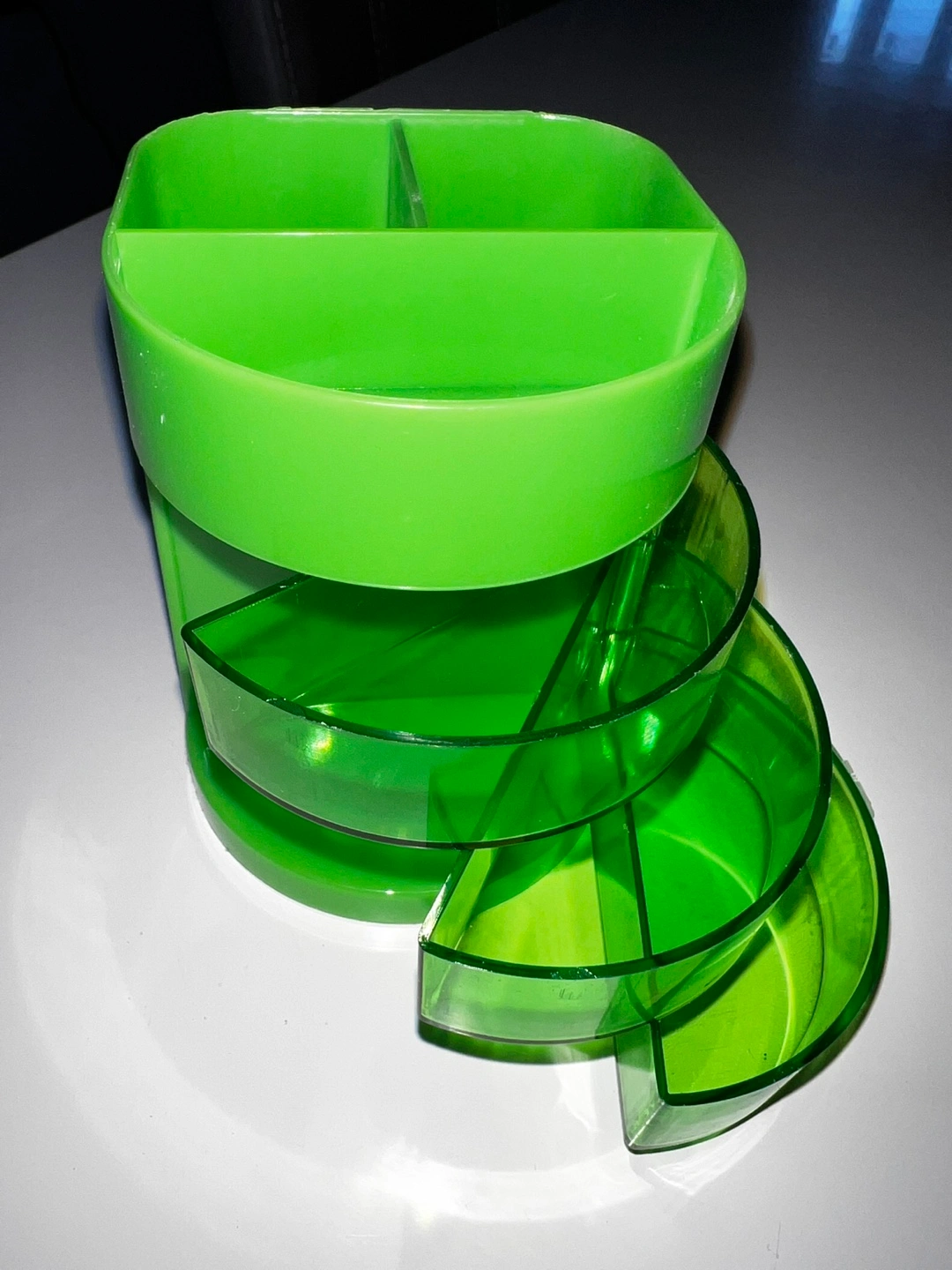 desk organiser. Three divided compartments on top. Three semi-circular drawers underneath. Bright green plastic. Ideal for stationery, makeup, or other small items. Shows some minor wear from age and use.