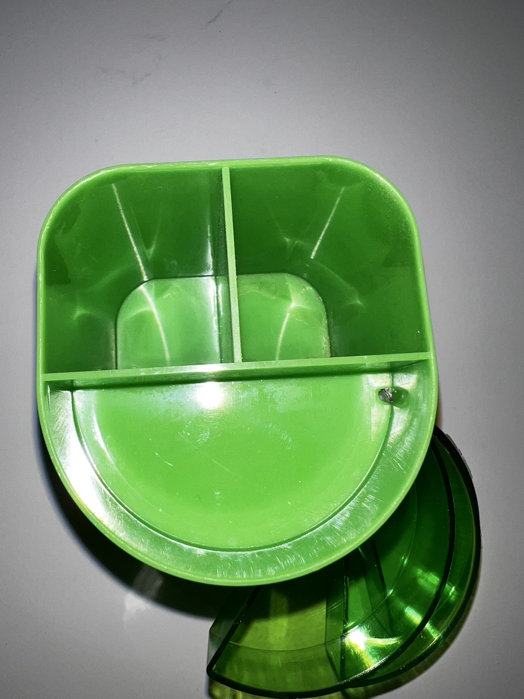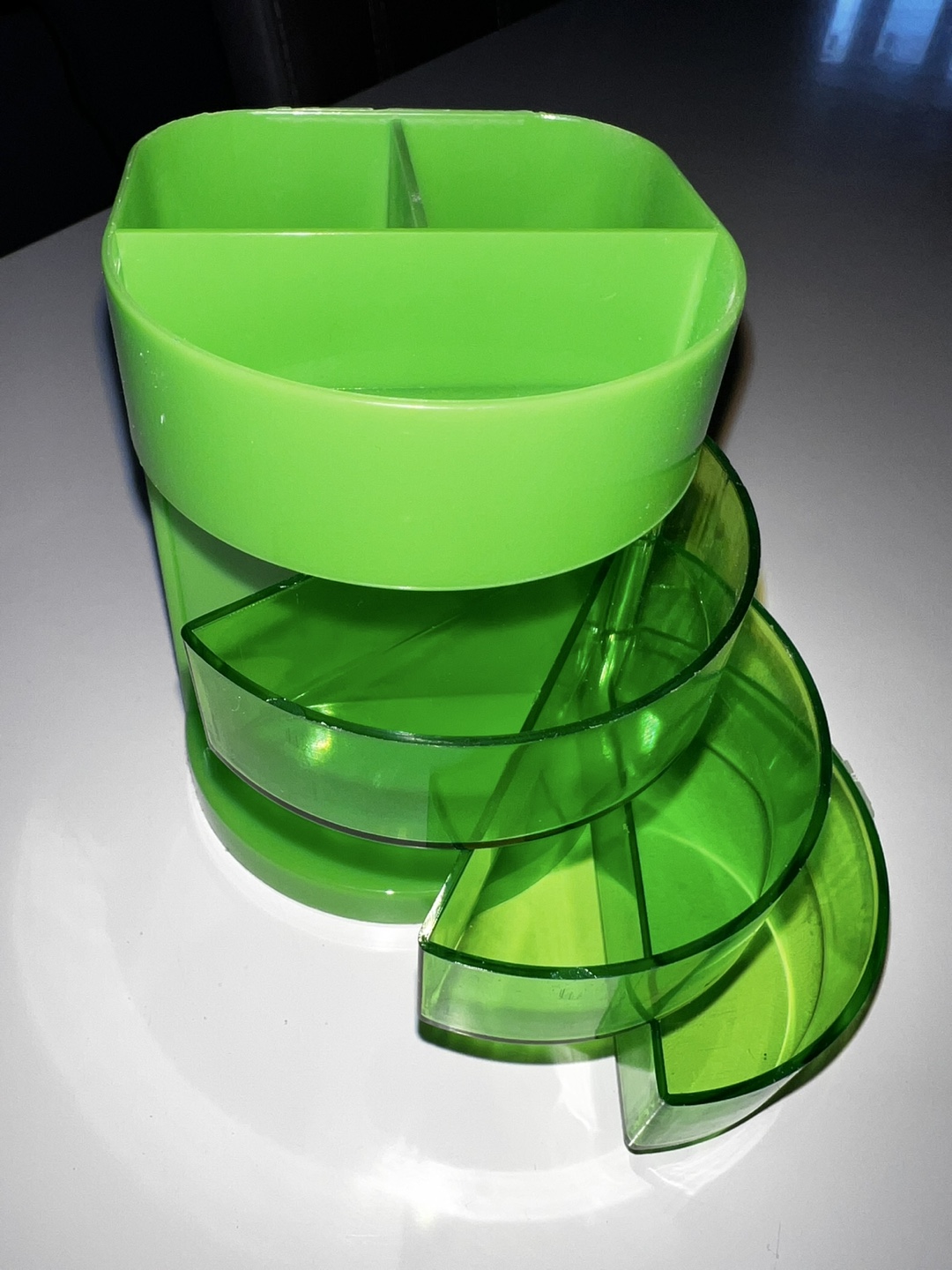desk organiser. Three divided compartments on top. Three semi-circular drawers underneath. Bright green plastic. Ideal for stationery, makeup, or other small items. Shows some minor wear from age and use.