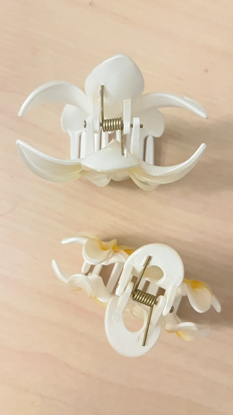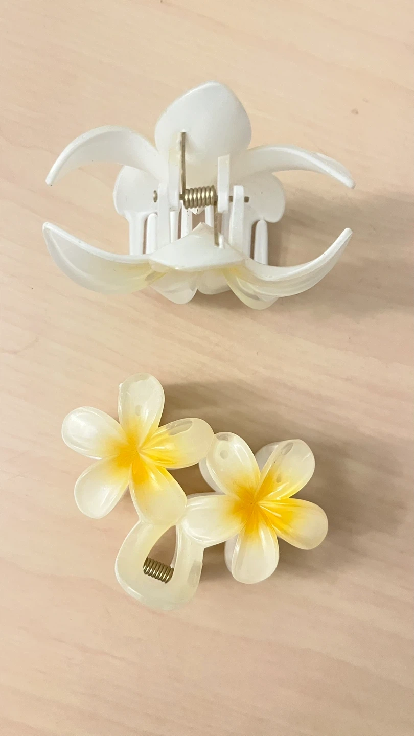 Two decorative hair claw clips with a white flower design. These clips add a touch of elegance to any hairstyle. Plastic material.