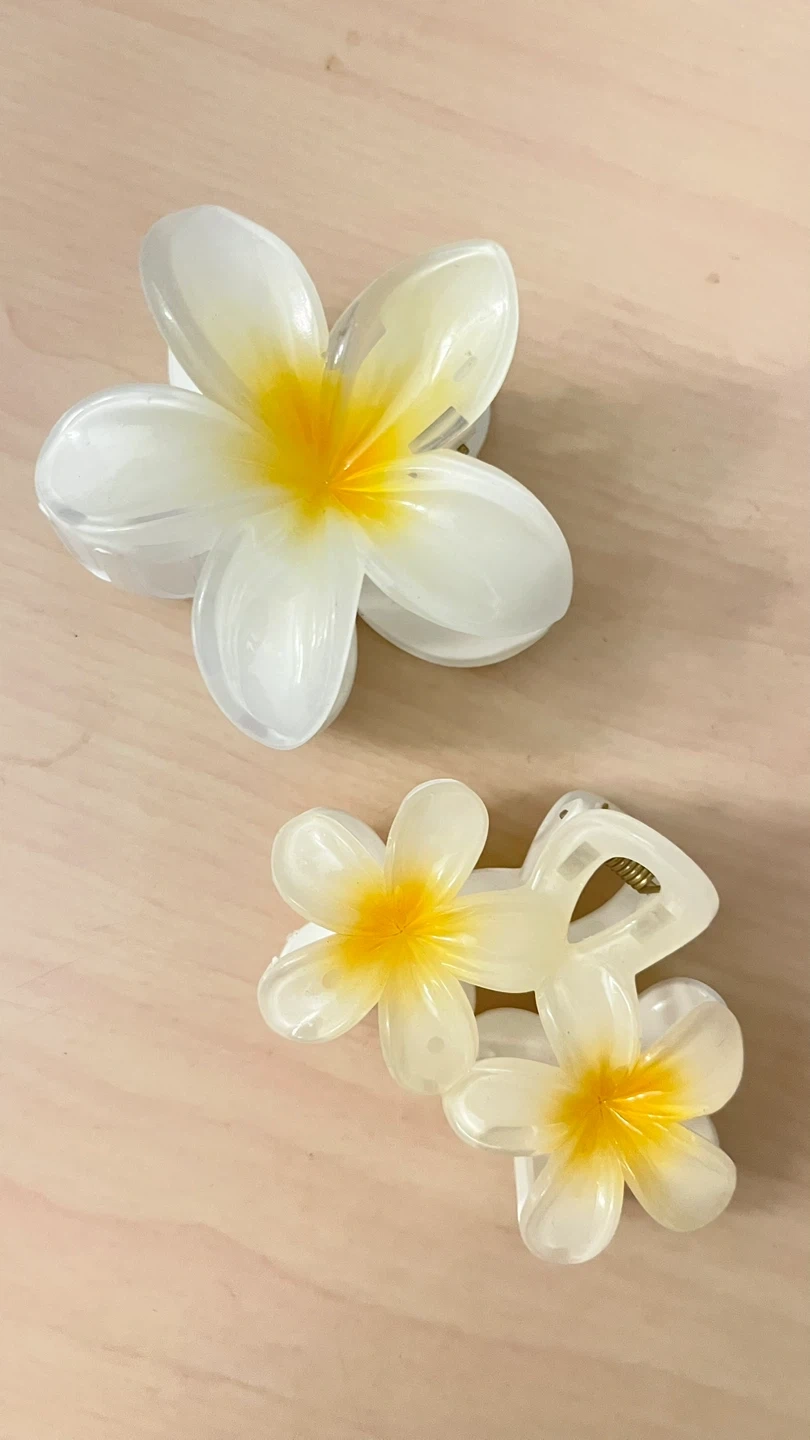 Two decorative hair claw clips with a white flower design. These clips add a touch of elegance to any hairstyle. Plastic material.