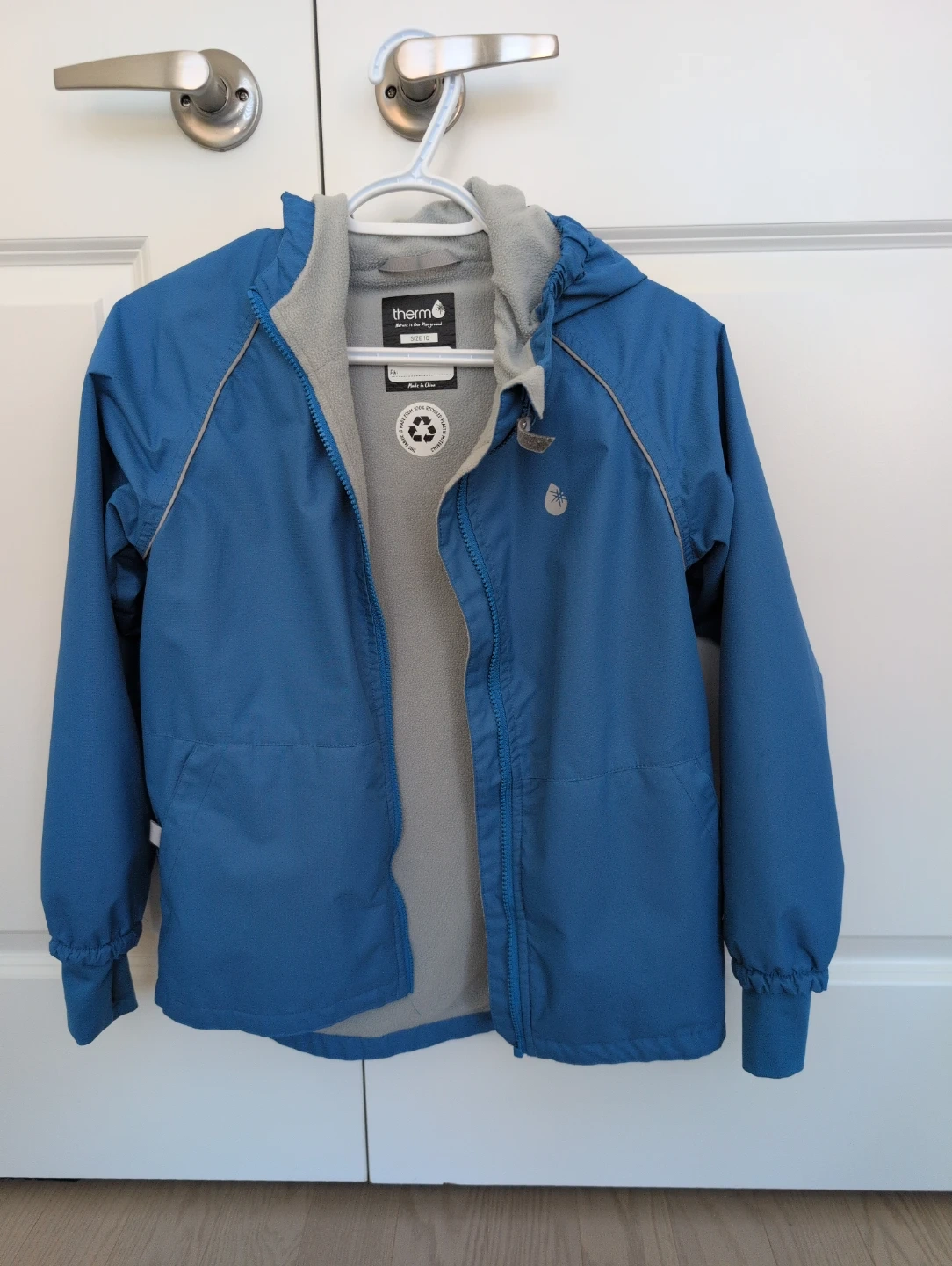 Thermo kids blue hooded jacket with a grey fleece lining. It features a full zip closure and elasticized cuffs. Great for keeping warm and dry! Reveals pattern in the rain!