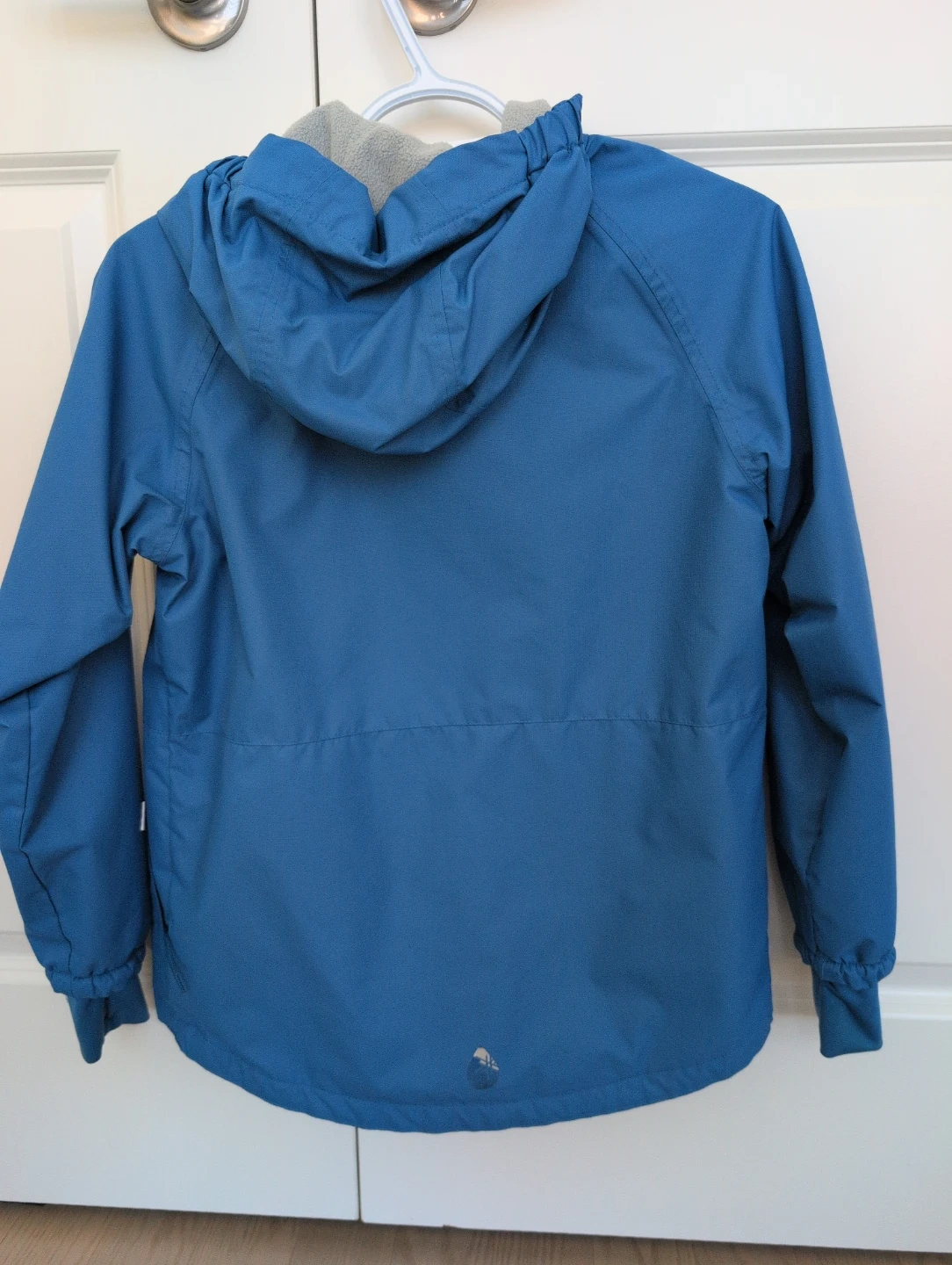 Thermo kids blue hooded jacket with a grey fleece lining. It features a full zip closure and elasticized cuffs. Great for keeping warm and dry! Reveals pattern in the rain!