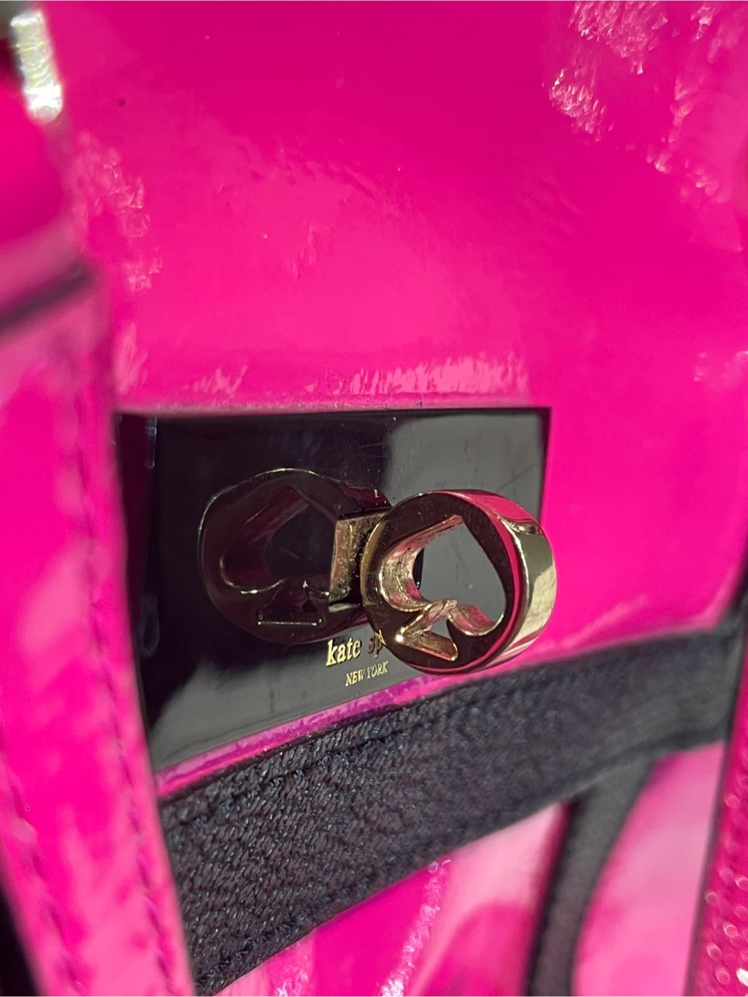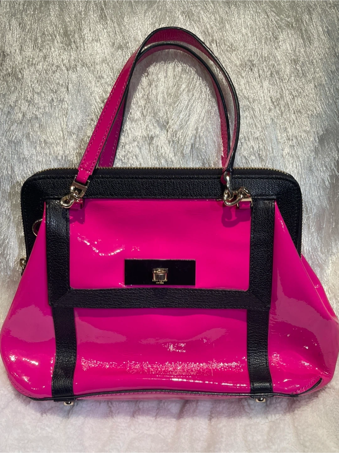 Stunning Authentic Kate Spade bag in vibrant pink patent cowhide leather with black trim – super eye-catching and perfect for spring/summer! This is a statement bag that is guaranteed to get many compliments.