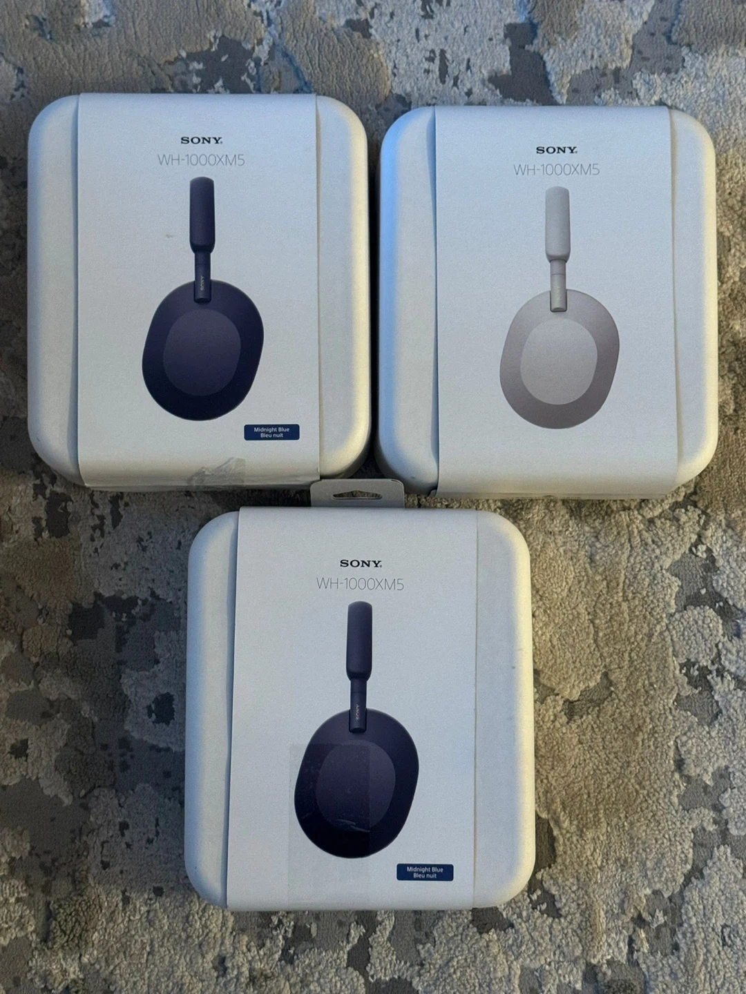 Three Sony WH-1000XM5 noise cancelling headphones. Two are in Midnight Blue, and one is in Silver. They're wireless and come in original packaging.