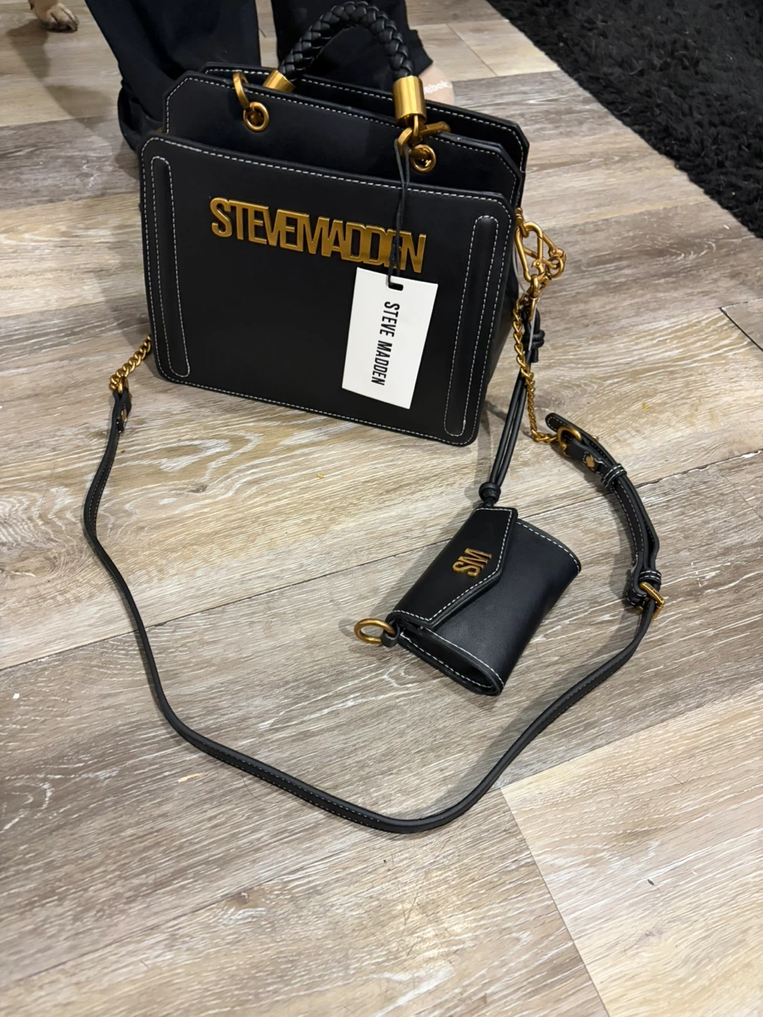 This is a black Steve Madden handbag. It comes with a matching mini pouch. The bag features gold-tone hardware and white contrast stitching. It has a braided top handle and an adjustable crossbody strap.
