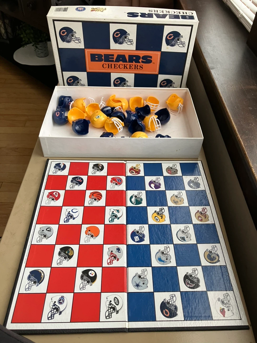 Selling a vintage Bears checkers game! This set includes the board, the checker pieces shaped like football helmets, and the original box. A fun game for any football fan!