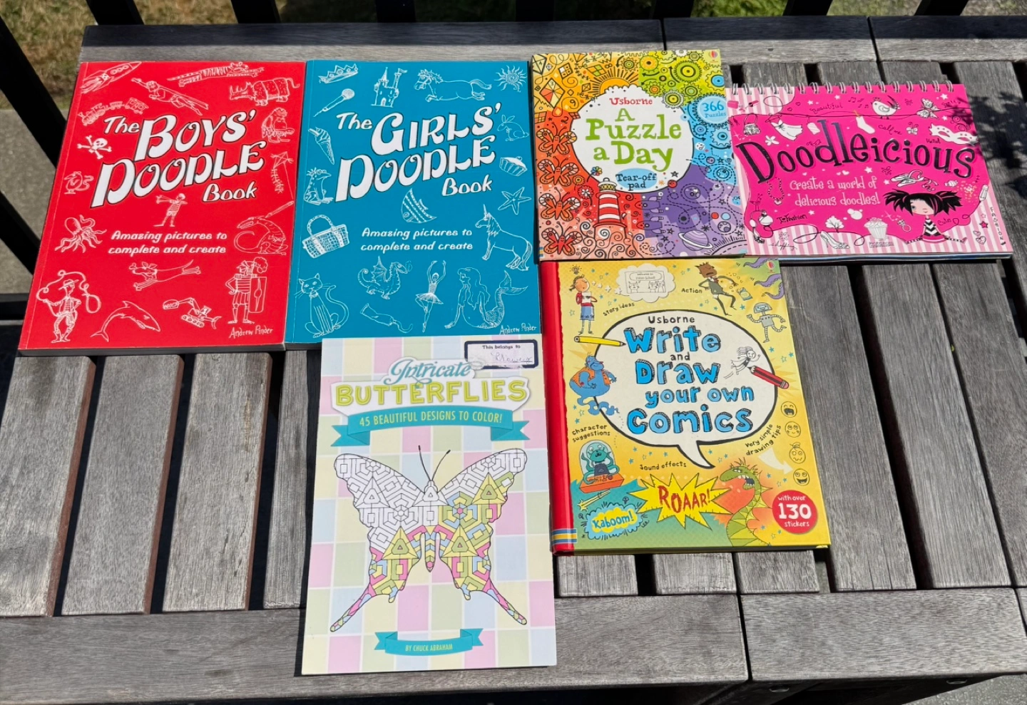 Selling a bundle of Usborne activity books! Includes: - The Boys' Doodle Book: Amazing pictures to complete and create - The Girls' Doodle Book: Amazing pictures to complete and create - A Puzzle a Day: Tear-off pad with 366 puzzles - Doodleicious: Create a world of delicious doodles! - Intricate Butterflies: 45 beautiful designs to color! - Write and Draw your own Comics: With over 130 stickers! Great for creative activity or early finishers. $3 each or $15 for ALL.