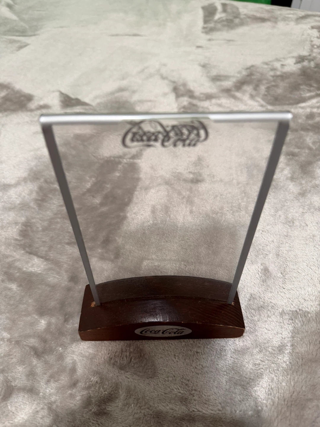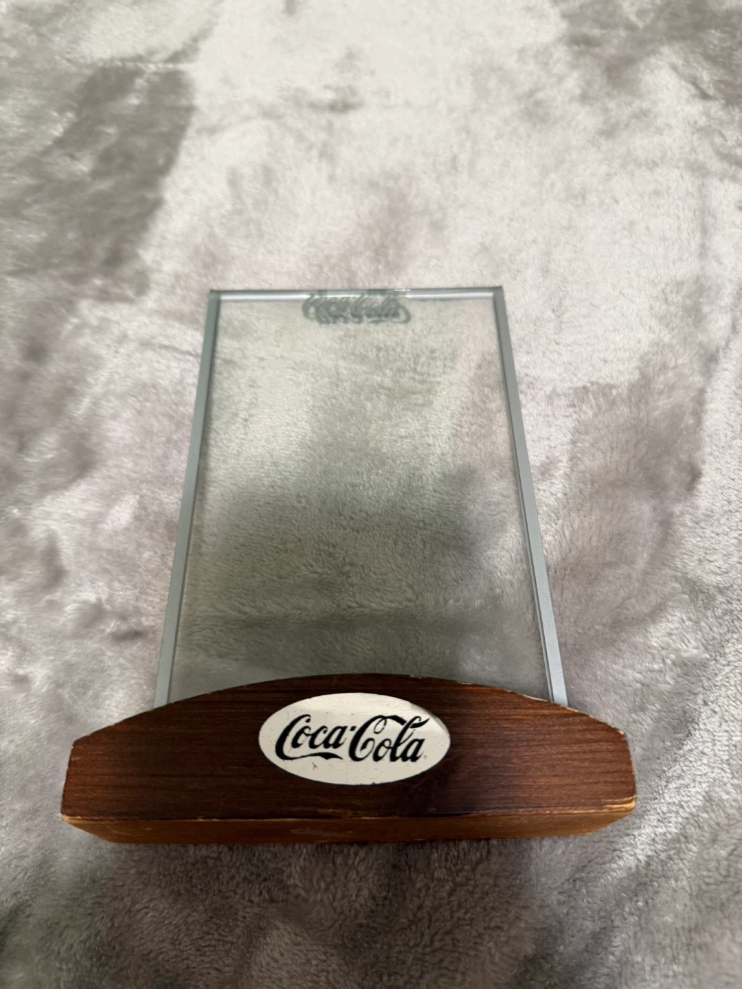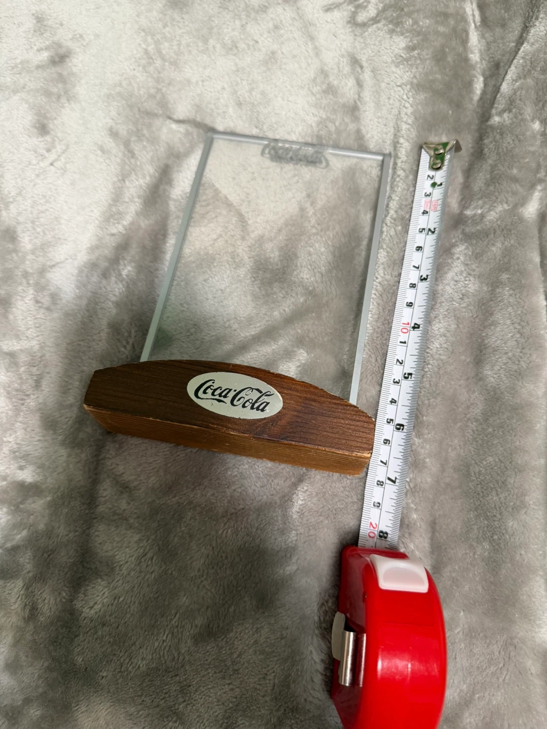 This is a Coca-Cola menu holder with a wooden base and clear display frame. It's great for displaying photos or restaurant menus. The base is approximately 6 inches long.