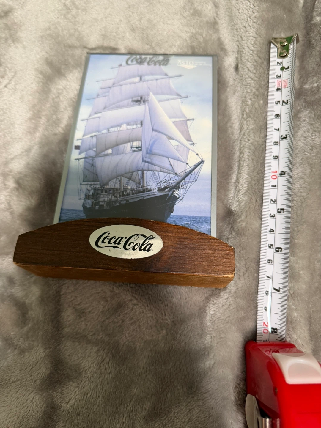 This is a Coca-Cola menu holder with a wooden base and clear display frame. It's great for displaying photos or restaurant menus. The base is approximately 6 inches long.