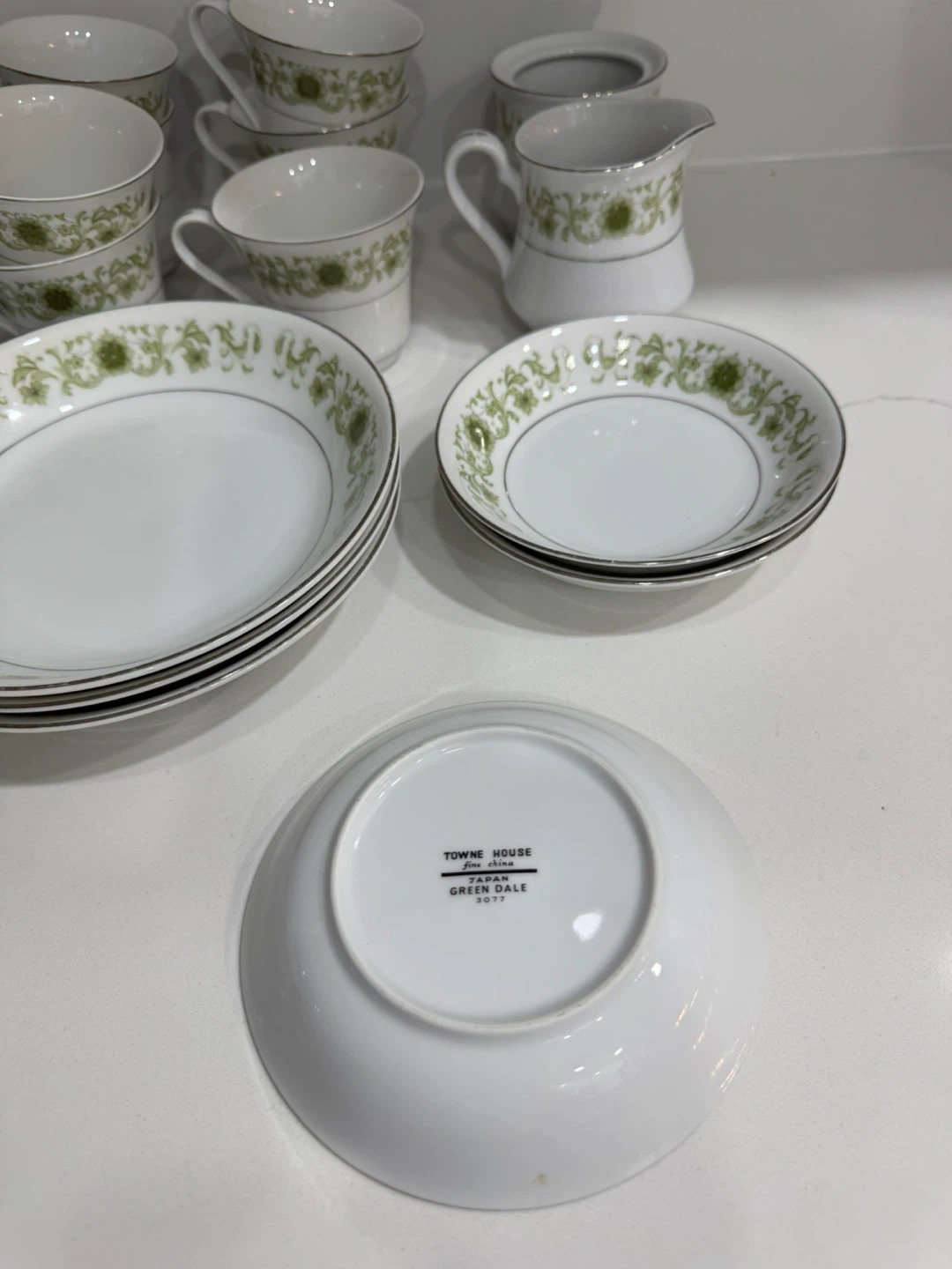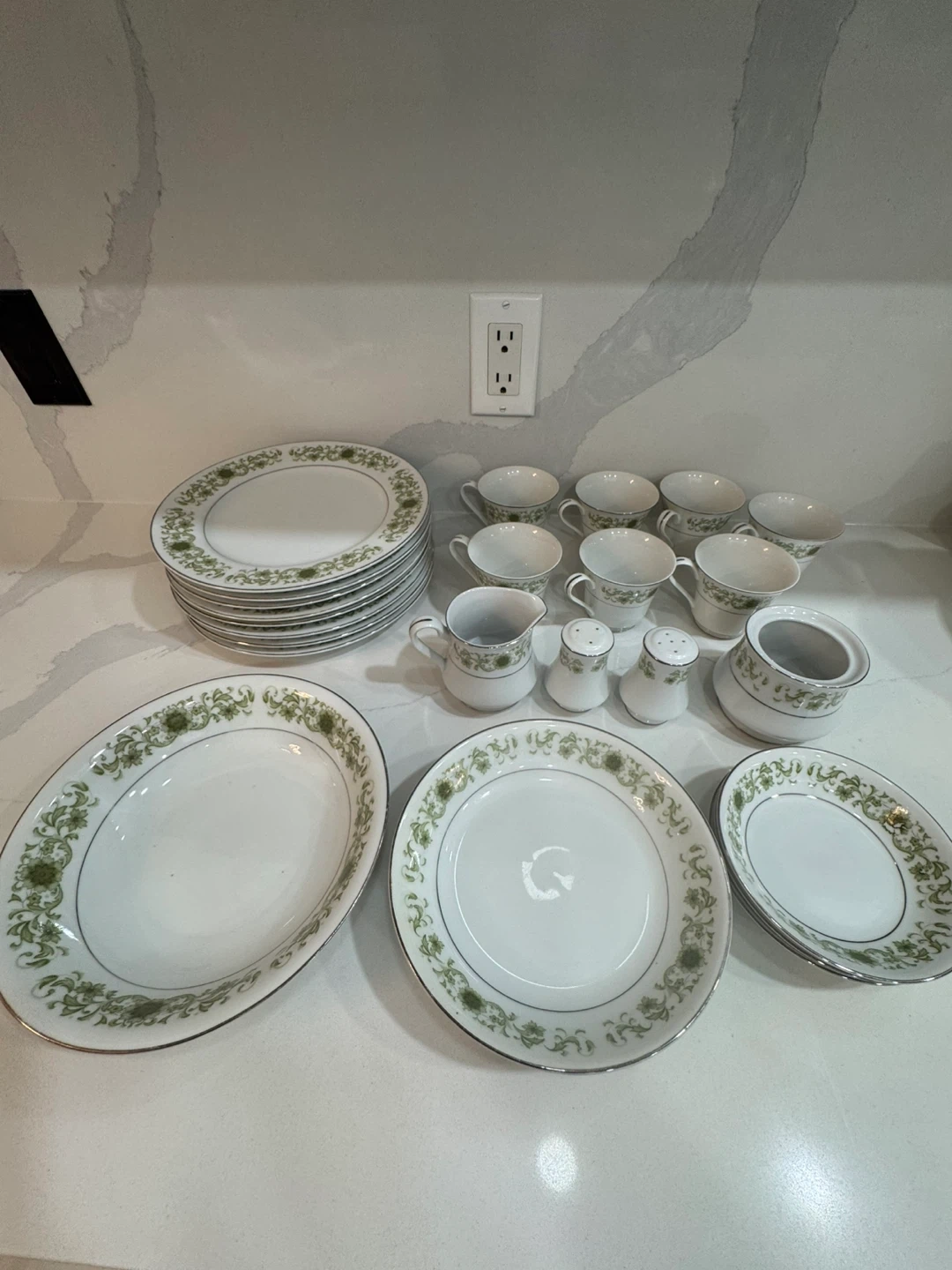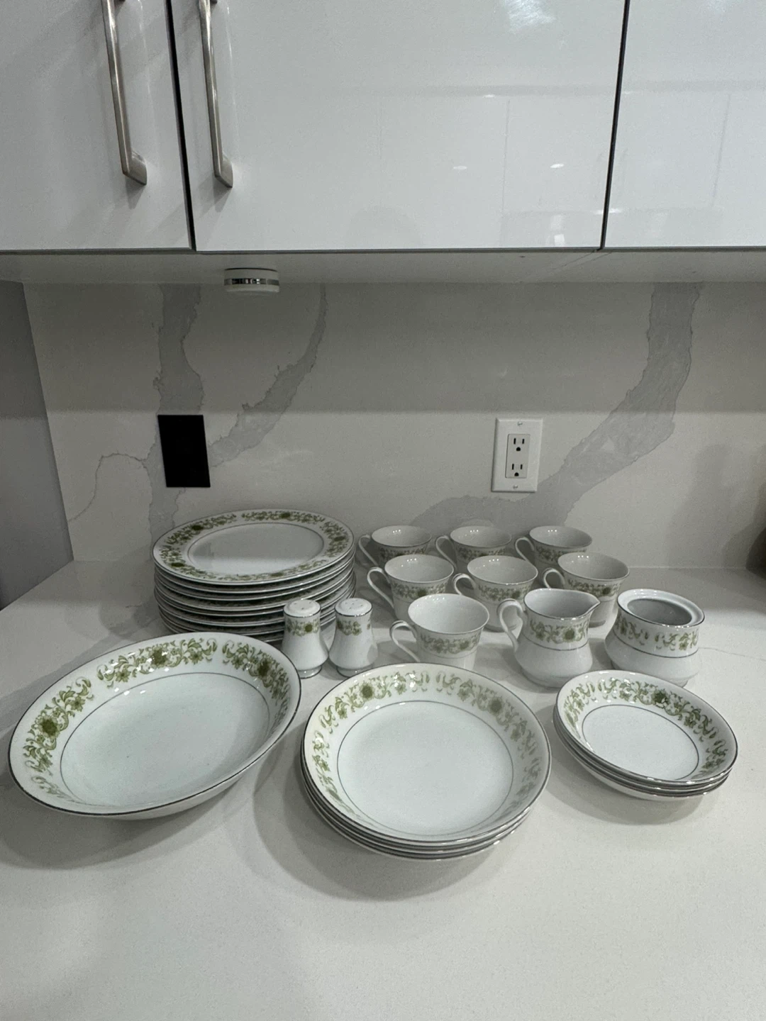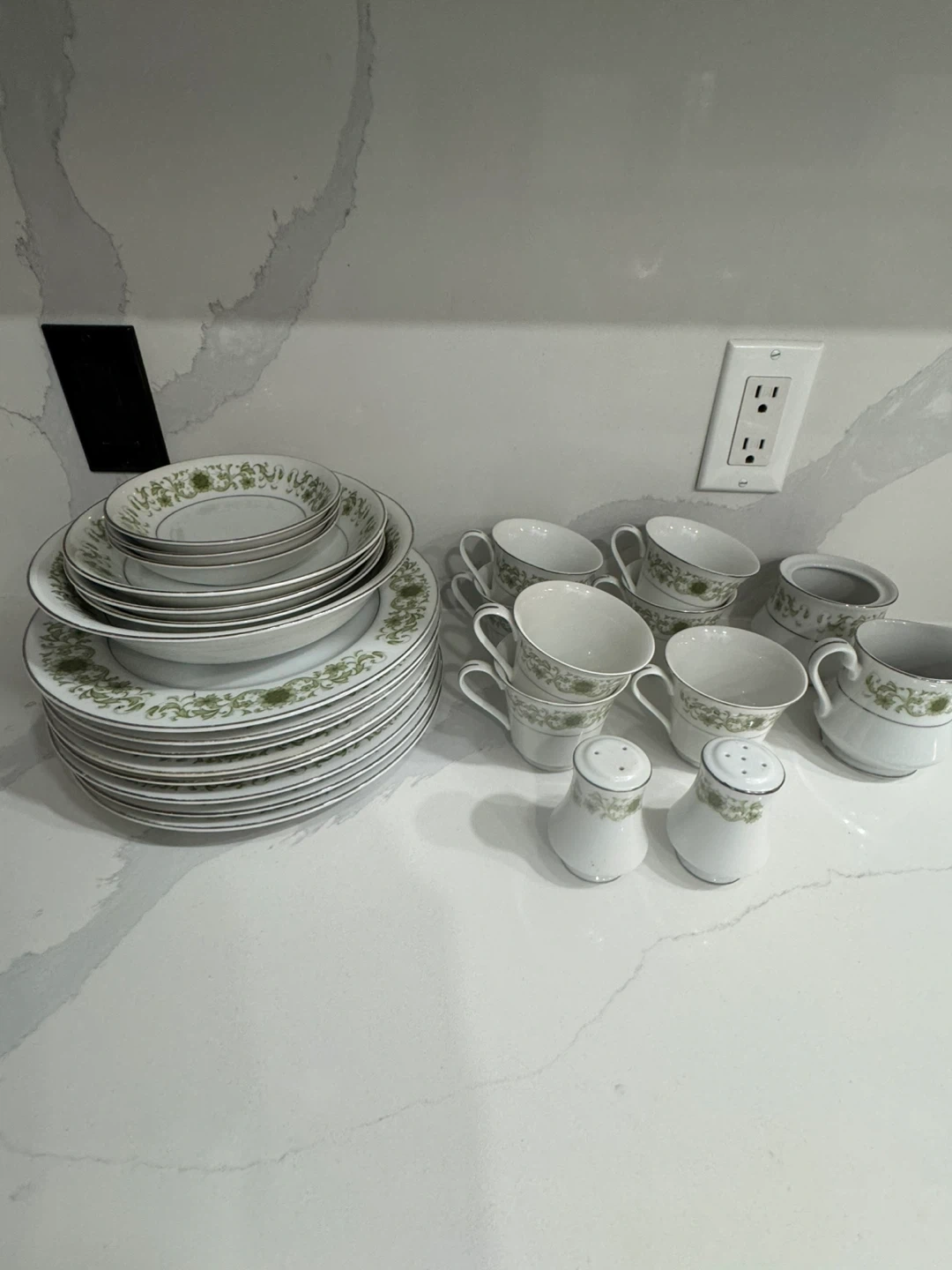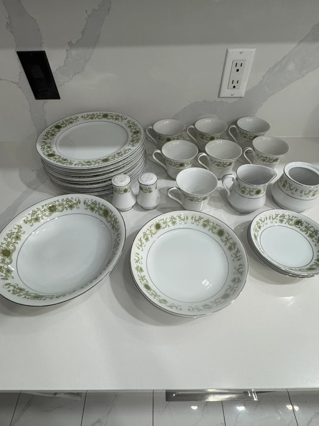 This vintage china set features a delicate green floral pattern on white porcelain. It includes dinner plates, bowls, cups, saucers, a creamer, a sugar bowl, and salt and pepper shakers. It's perfect for hosting special occasions or adding a touch of elegance to everyday meals. Total if 26 pieces, $90 or best offer. Pick up at Steeles & Bathurst area.