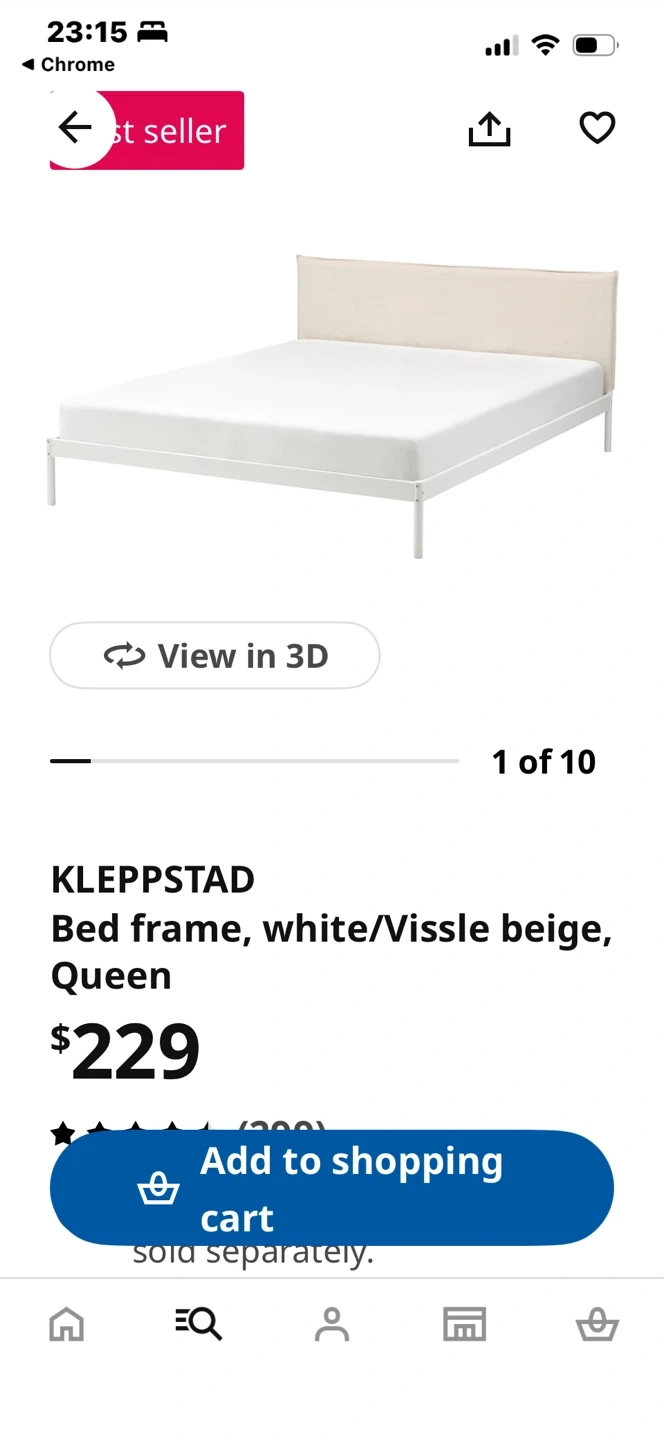This is an IKEA KLEPPSTAD bed frame. It's a Queen size in white with a Vissle beige headboard. The frame is made of metal with a upholstered headboard.