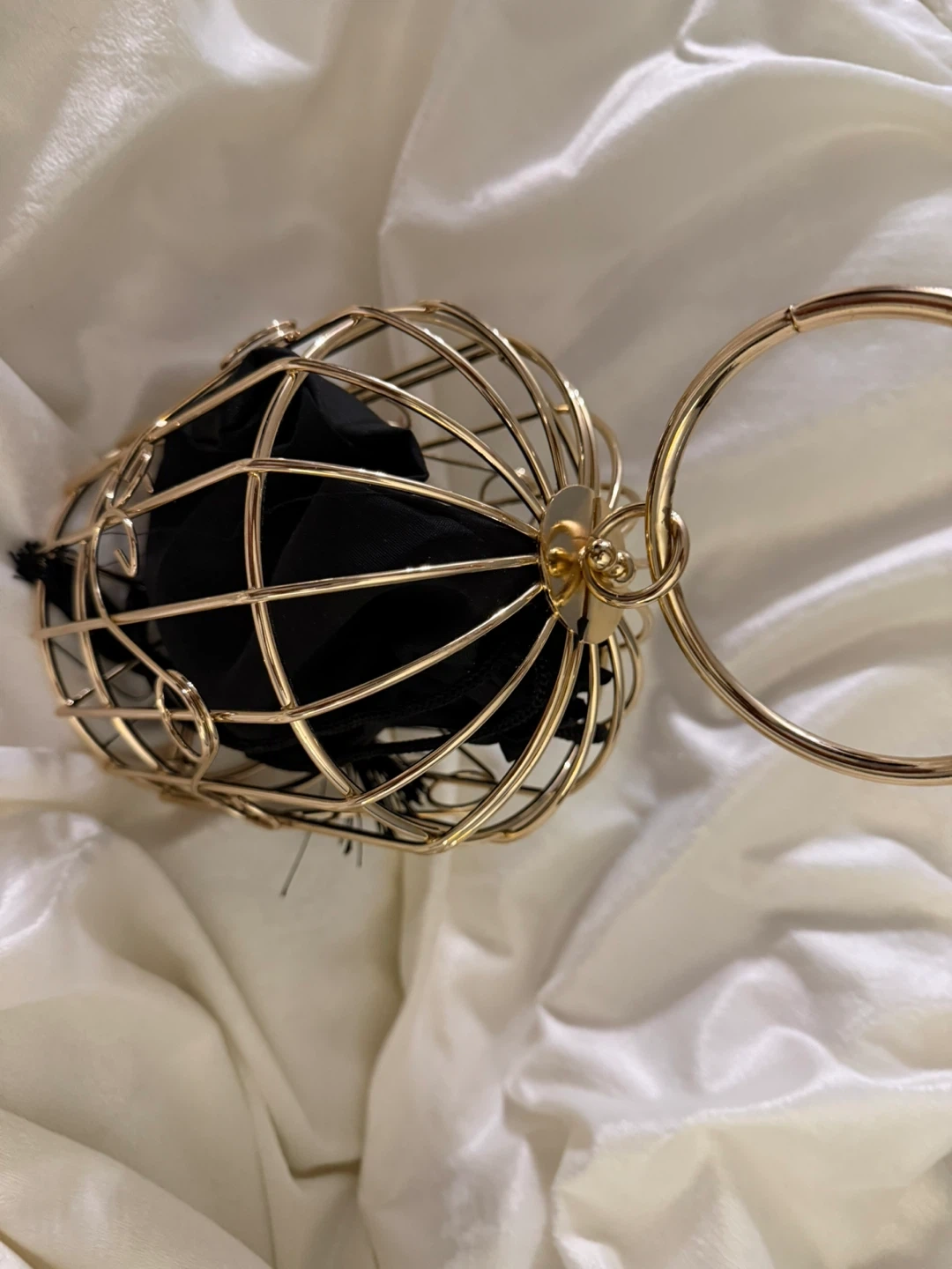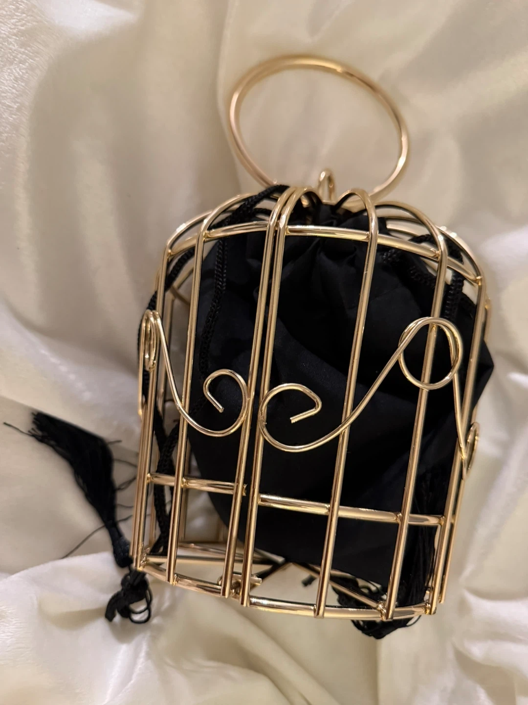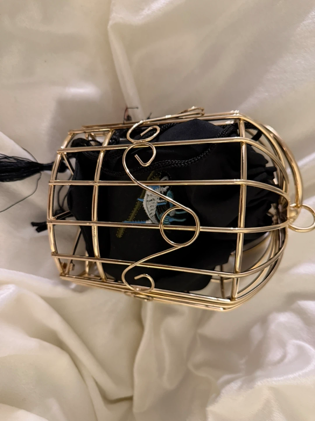 This unique clutch features a striking gold birdcage-style exterior with a drawstring black pouch inside. The pouch is embellished with a delicate blue and white bird embroidery. It's a real conversation starter for any special occasion!