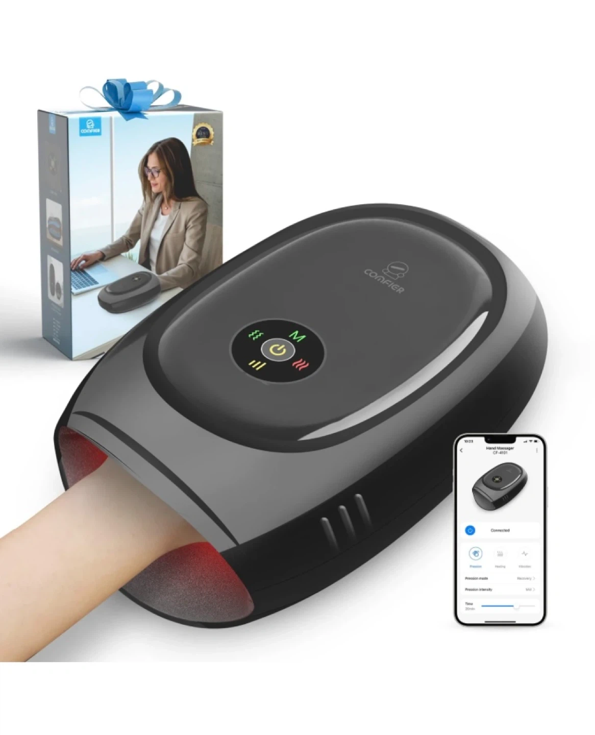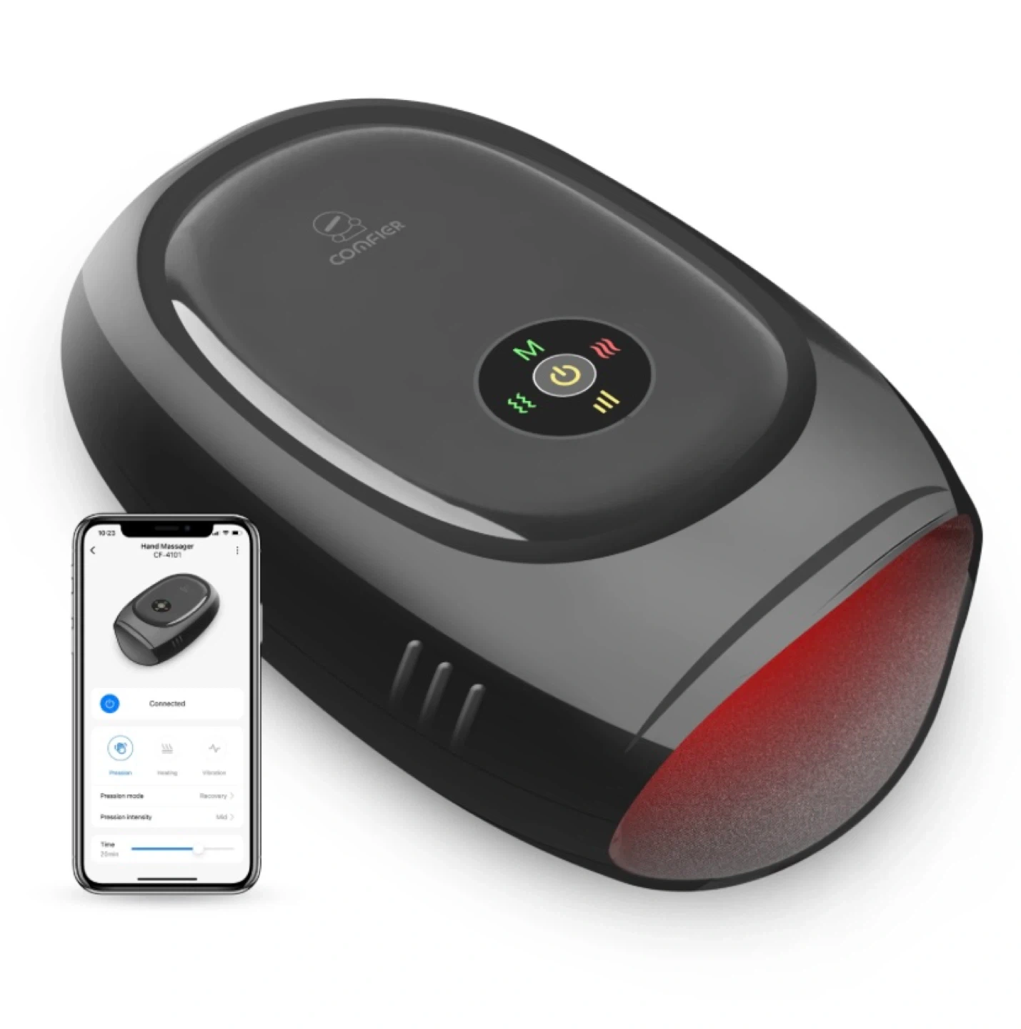 This Comfier hand massager uses air compression and heat to soothe tired hands. It features multiple modes and intensity levels, controllable via an app. It's designed for relaxation and relief.