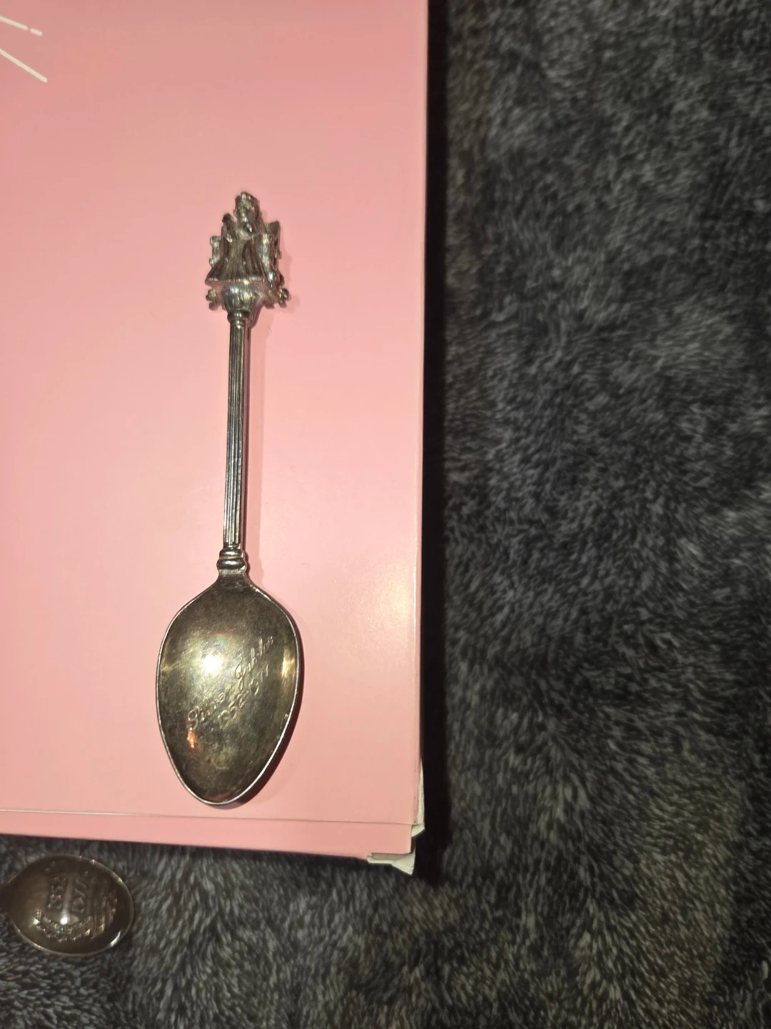 This spoon has a decorative finial and an engraved bowl. The engraving reads 'First Child 1956-1977'. It's made of silver-plated metal. Useful for display or as a collectible item.
