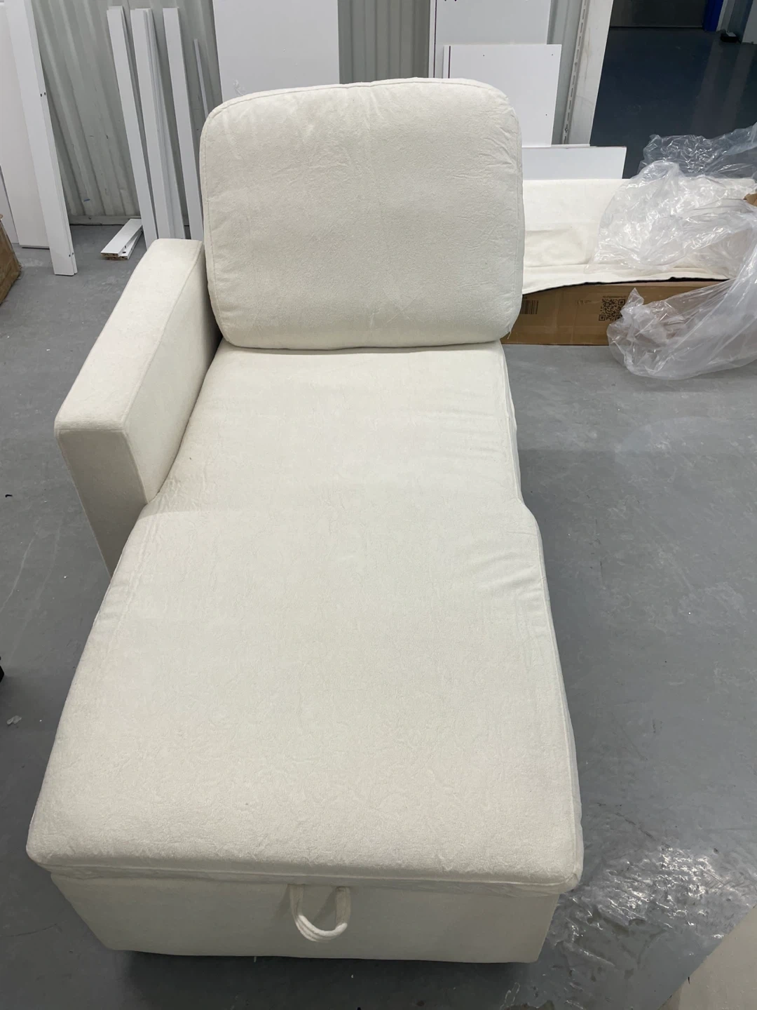This chaise lounge is upholstered in a soft, cream-coloured fabric. It features a storage compartment underneath the seat, accessible by a loop handle. It's a great addition for extra seating or lounging.