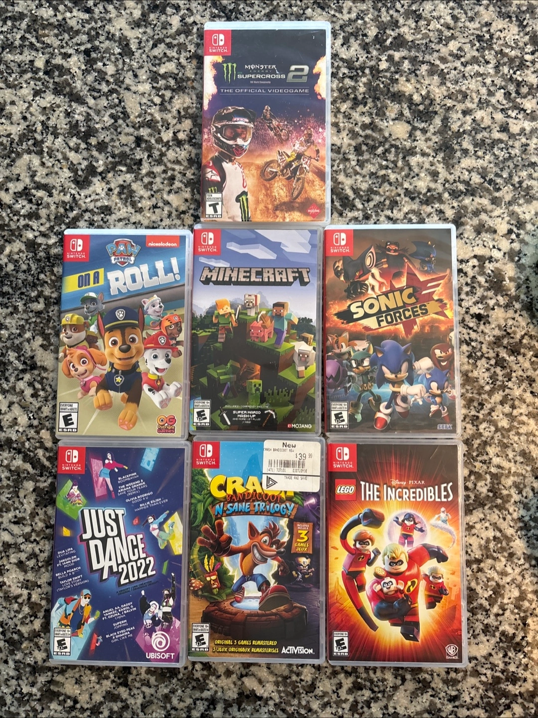 Bundle of seven pre-owned Nintendo Switch game cartridges. Titles include Monster Supercross 2, Paw Patrol On a Roll, Minecraft, Sonic Forces, Just Dance 2022, Crash Bandicoot N. Sane Trilogy, and Lego The Incredibles. Games are in good condition.