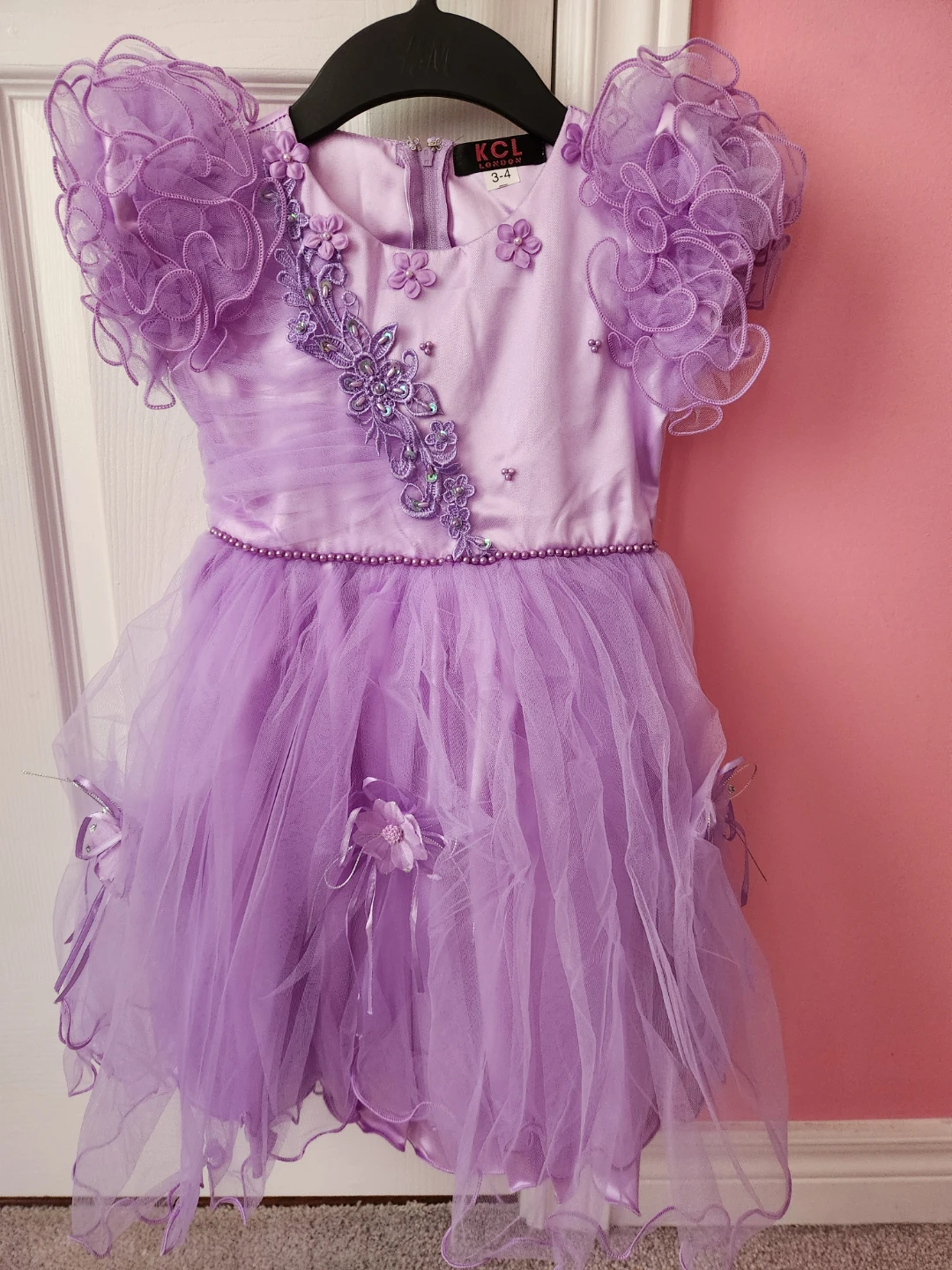 Lovely lavender dress. It features a satin bodice with beaded embellishments and delicate floral accents. The full tulle skirt has multiple layers and is adorned with bows and fabric flowers. Size is 3-4.