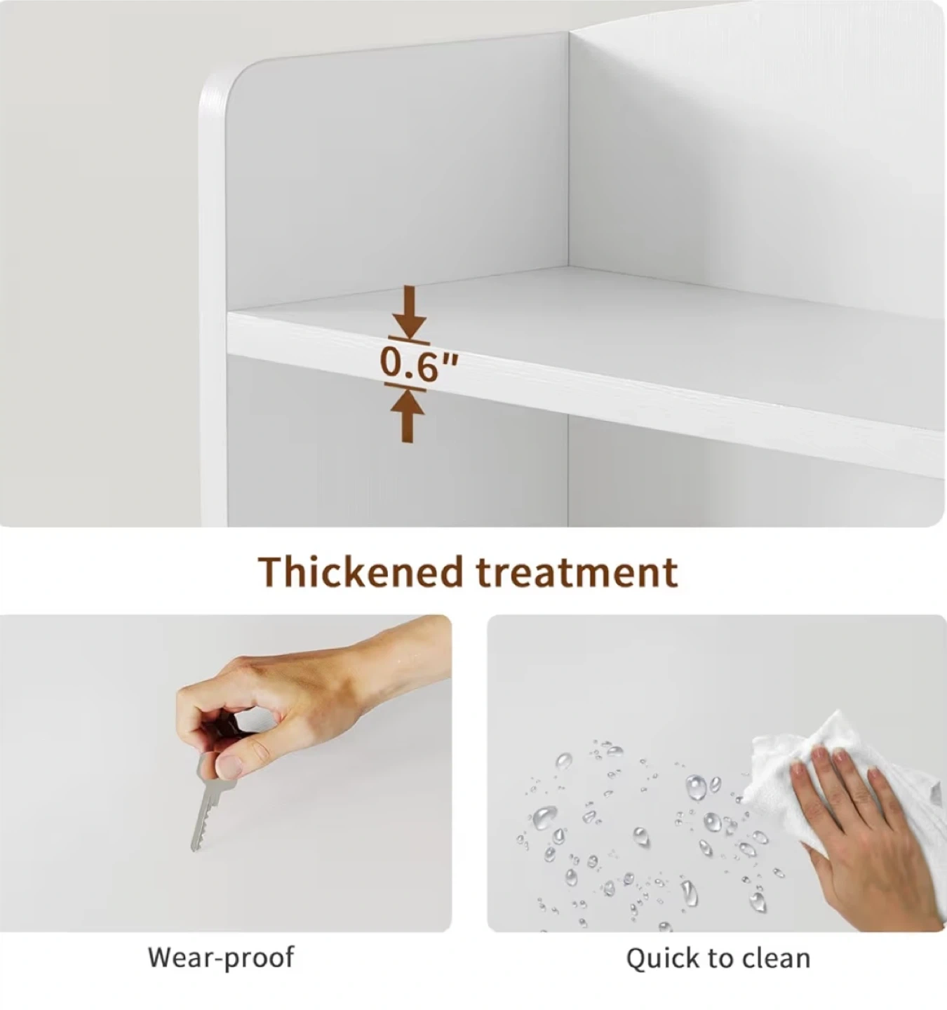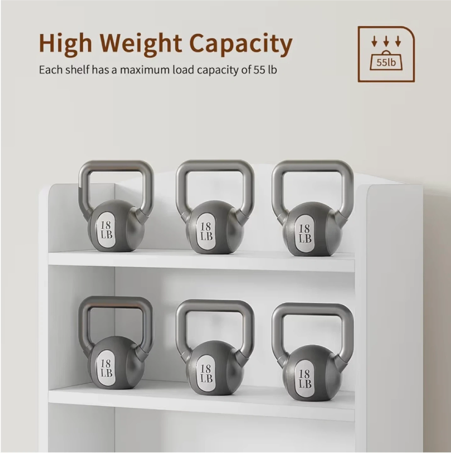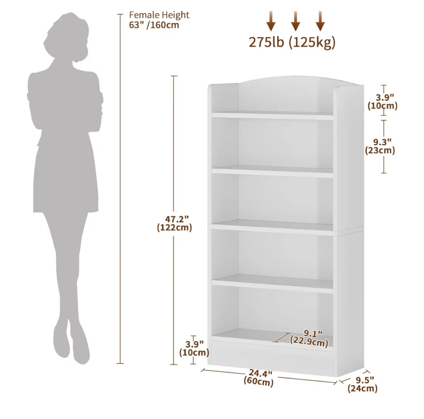 S This is a white 5-shelf bookshelf. It measures 47.2 inches tall and 24.4 inches wide. Each shelf supports up to 55 lbs and the overall unit supports 275 lbs. It's wear-proof and quick to clean.