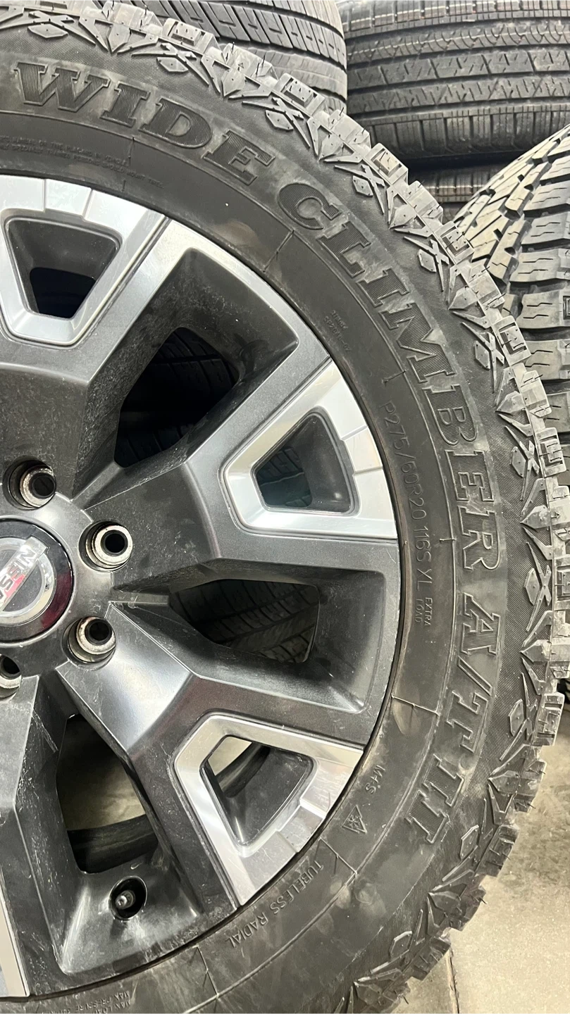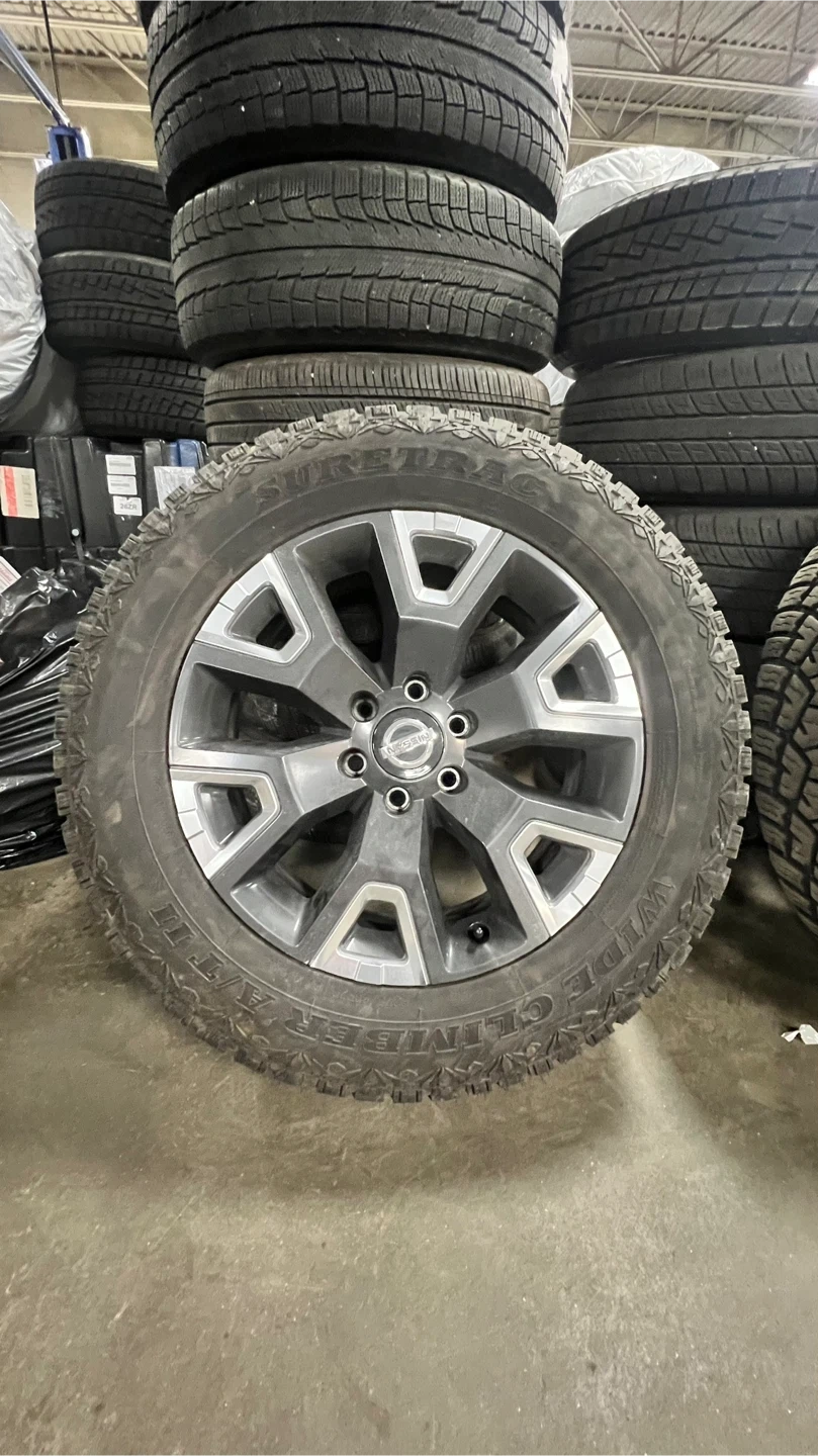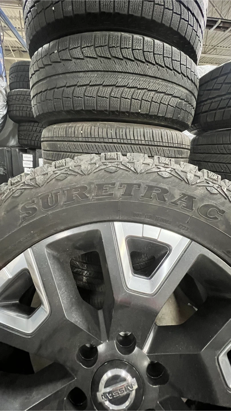 Set of four wide trail all-terrain tires mounted on Nissan rims. Tires are SURTRAC Wide Climber.