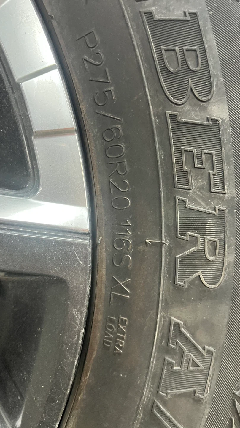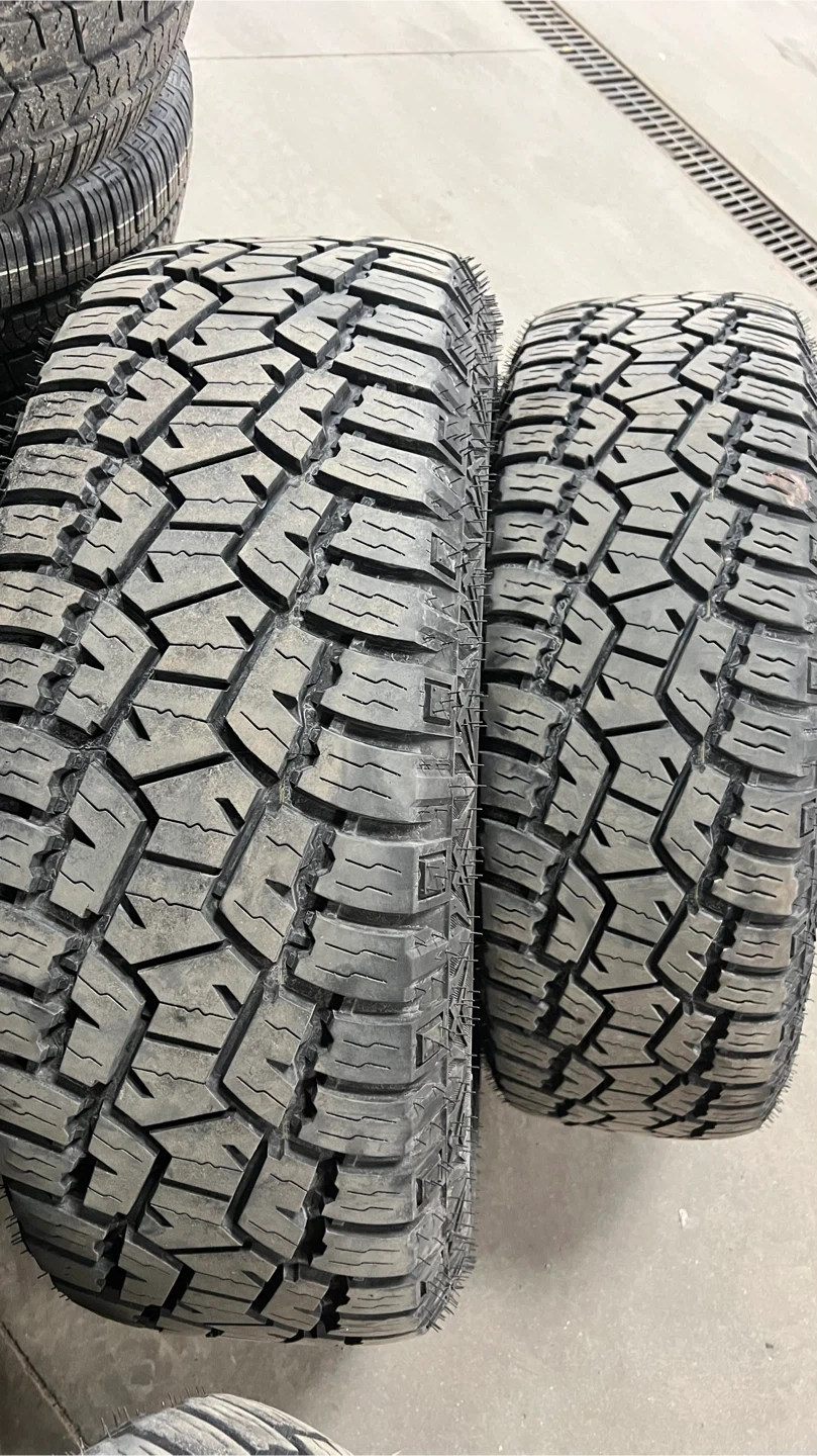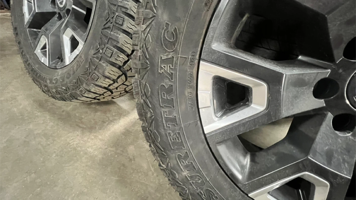 Set of four wide trail all-terrain tires mounted on Nissan rims. Tires are SURTRAC Wide Climber.
