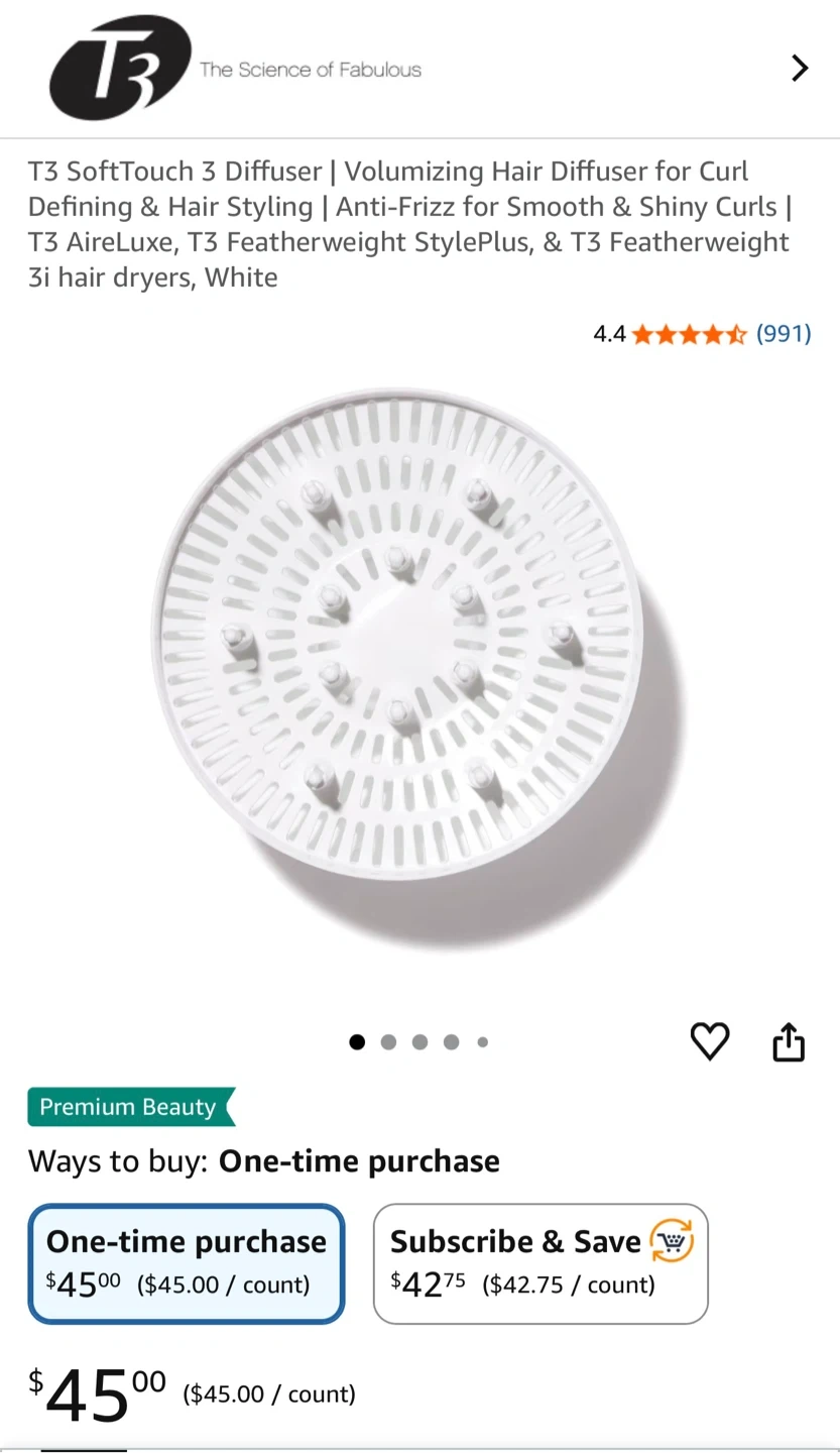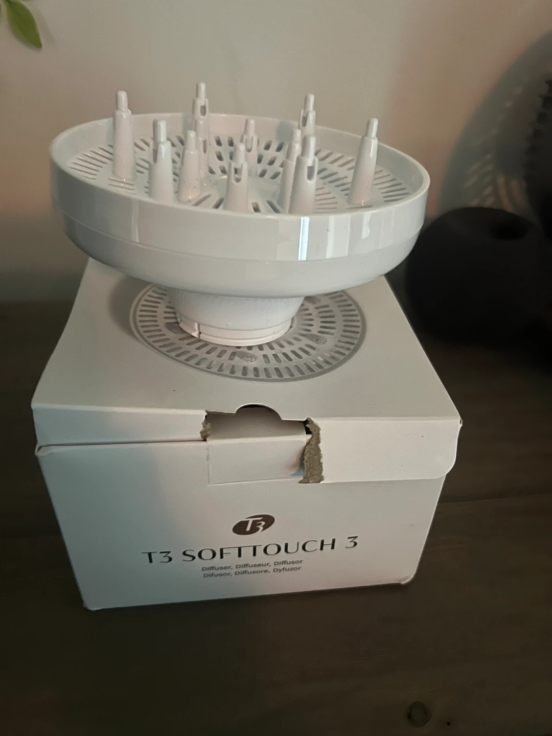 This is the T3 SoftTouch 3 Diffuser, designed for curl defining and hair styling. It helps with anti-frizz for smooth and shiny curls. It's white and includes the original box.